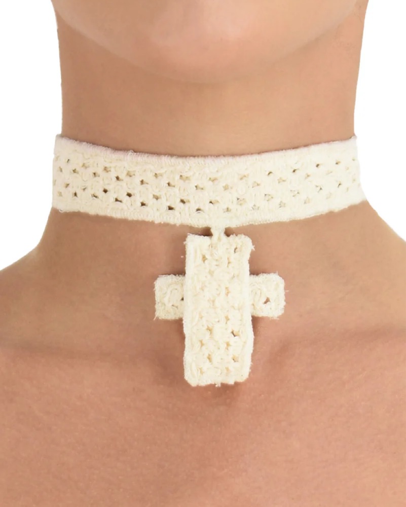 The “Luz” Cross Choker in beige from the brand Heart of Sun. Style it with a white t-shirt, with a crochet swim top, or for a festival or western vibe.