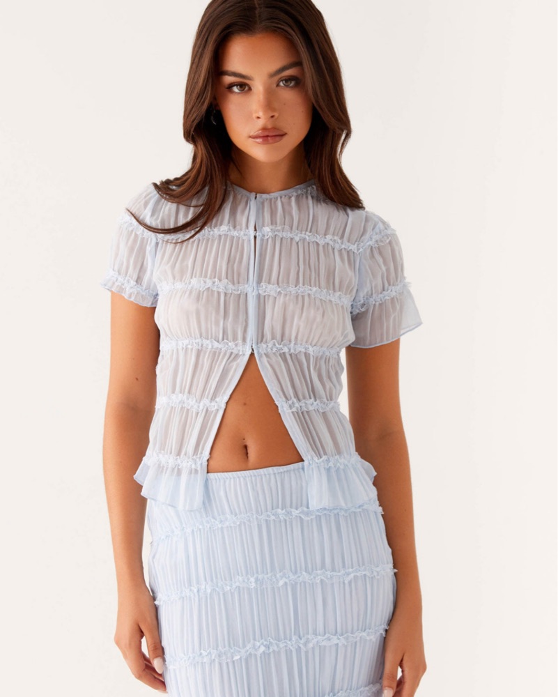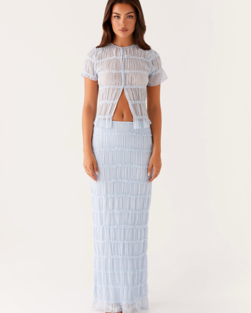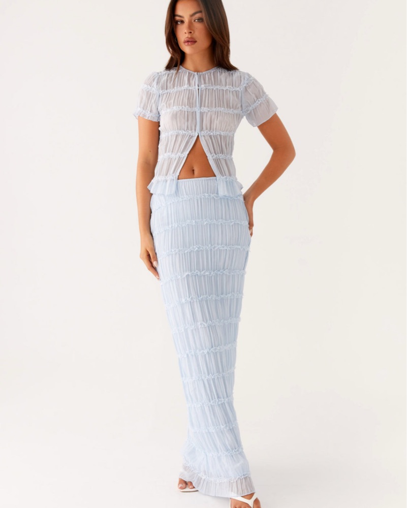 Baby blue top and low rise skirt from peppermayo. Top is a US 4/small and bottoms are a US 2/ XS