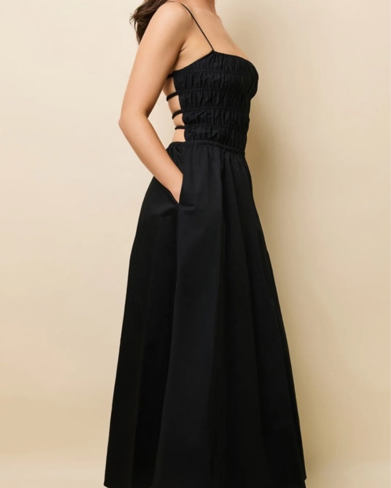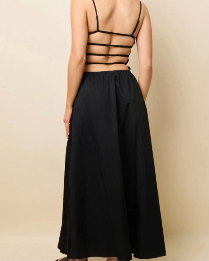 Black sundress with nicer material than cotton, can be dressed up or down! Backless detail, no bra needed