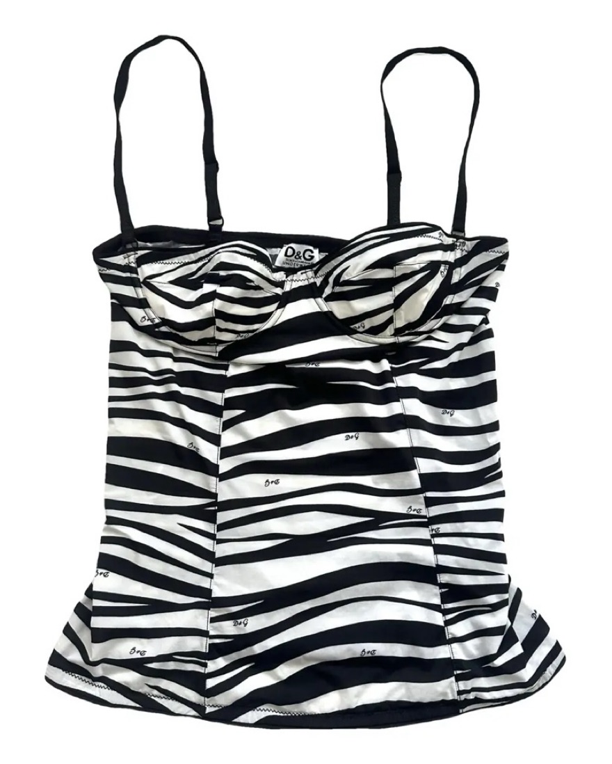 Bustier style cami with adjustable straps. Fits A & B cups best. So so cute with zebra print. Fun for a night out, party, date, etc. Dolce & Gabbana, D & G, Orseund Iris, Vintage corset cami Danielle Guizio designer Arcina Ori Asta Resort