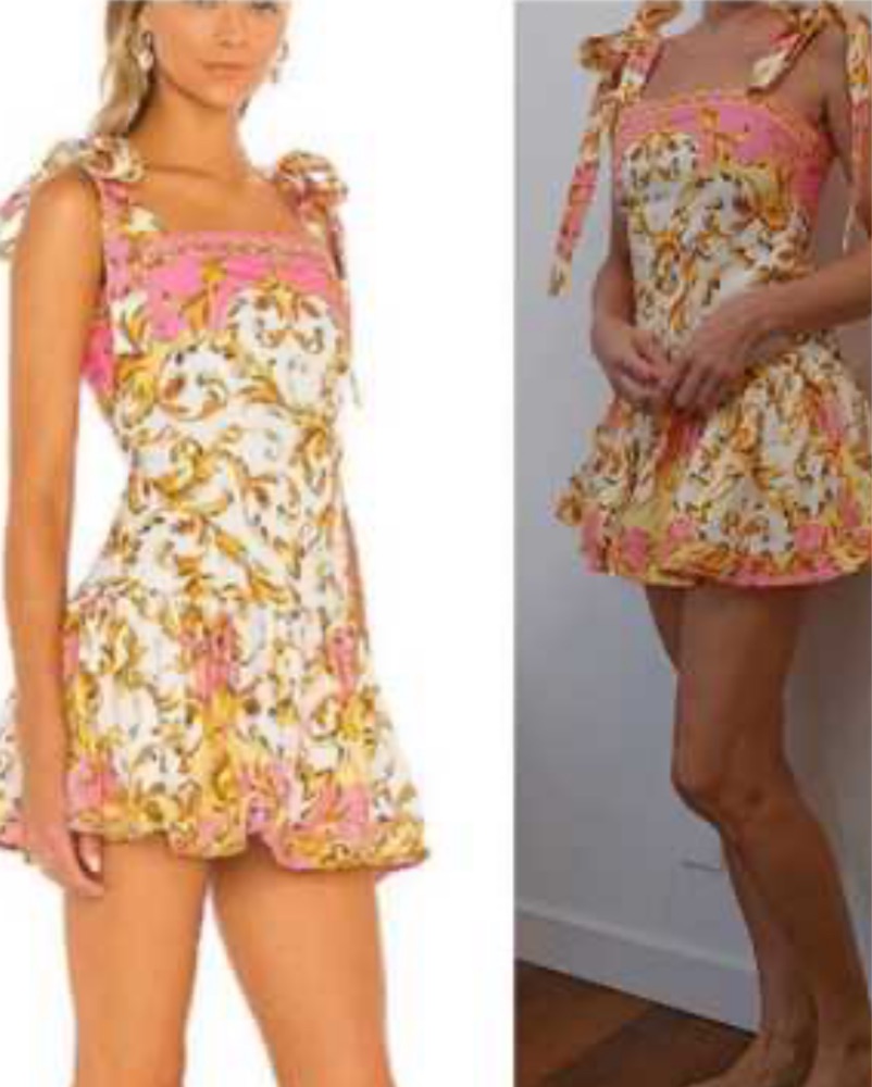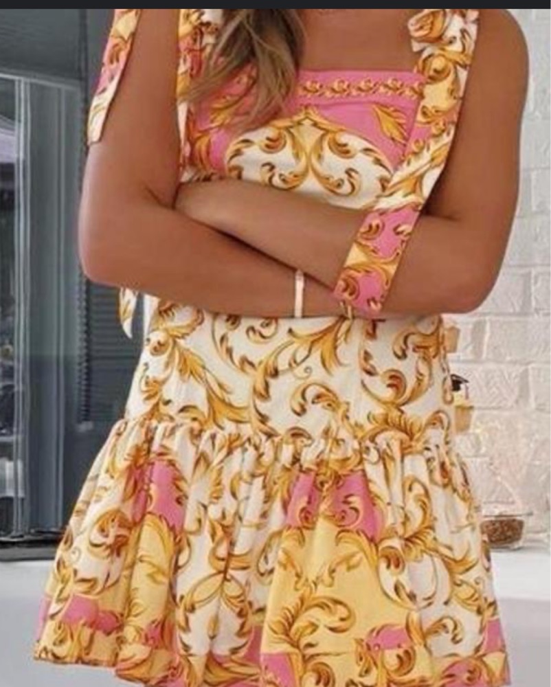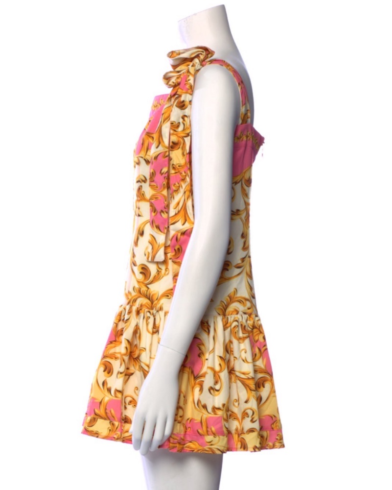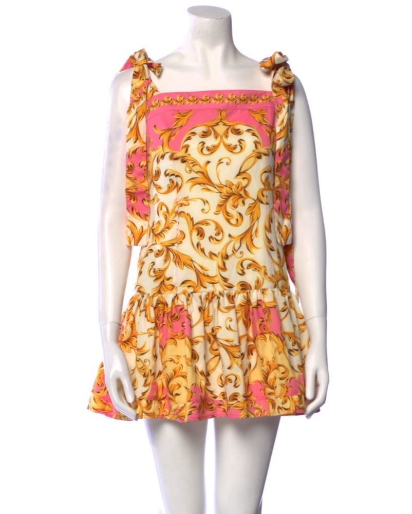 This playful floral mini dress is perfect for a summer party or brunch with friends. The ruffled straps and bold print add a whimsical touch. Looks like Versace