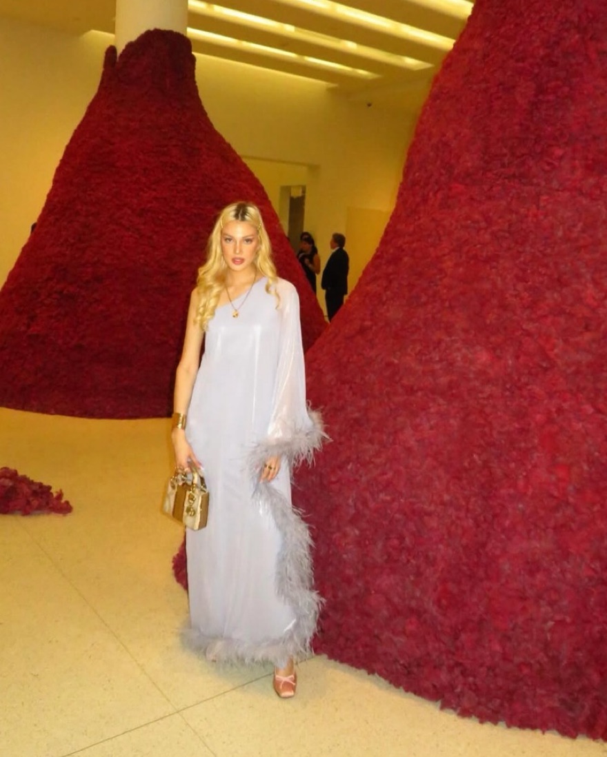 This elegant feathered chiffon gown is perfect for a glamorous event or red carpet affair. The flowing silhouette and luxurious feather accents create a striking and sophisticated look.
