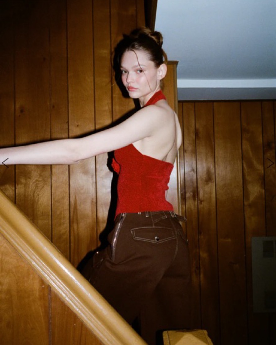 With jean red rose top (XS). Please no self tanner! Price includes dry cleaning fee but charges will apply for stains / damaged and late returns. Can fit XS/S. Knitted halter neck top with rose detail in the middle - perfect top.