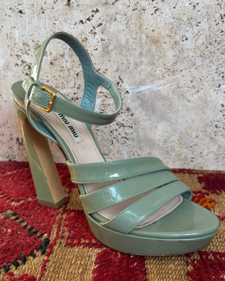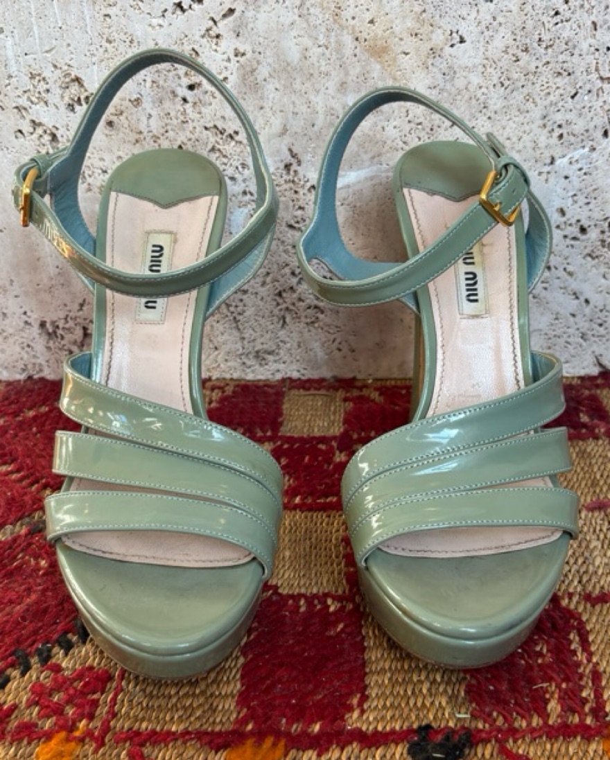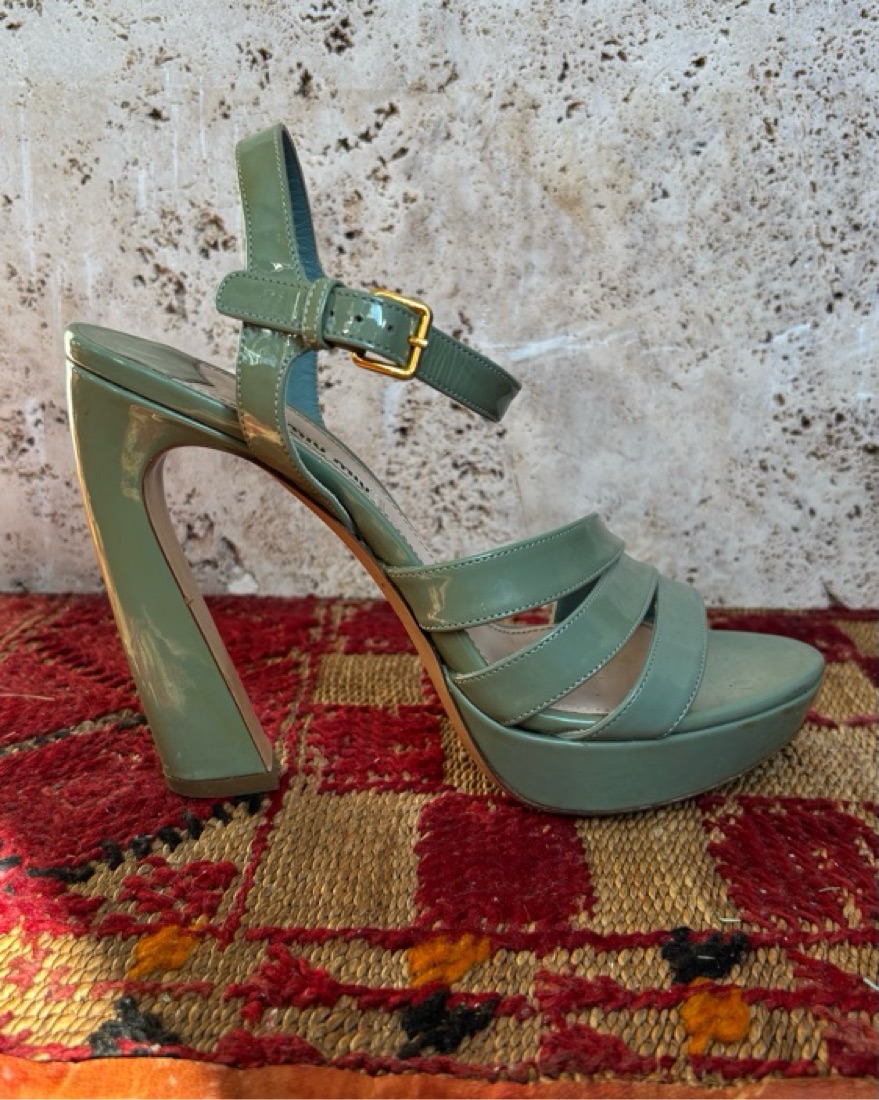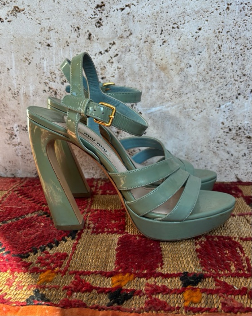 Vintage Miu Miu strappy sea foam heeled sandals. Iconic curved heel design and platform sole. Deeply obsessed 💚 size 38 and a bit narrow. Would fit 7.5 like a glove, but work fine for 8!