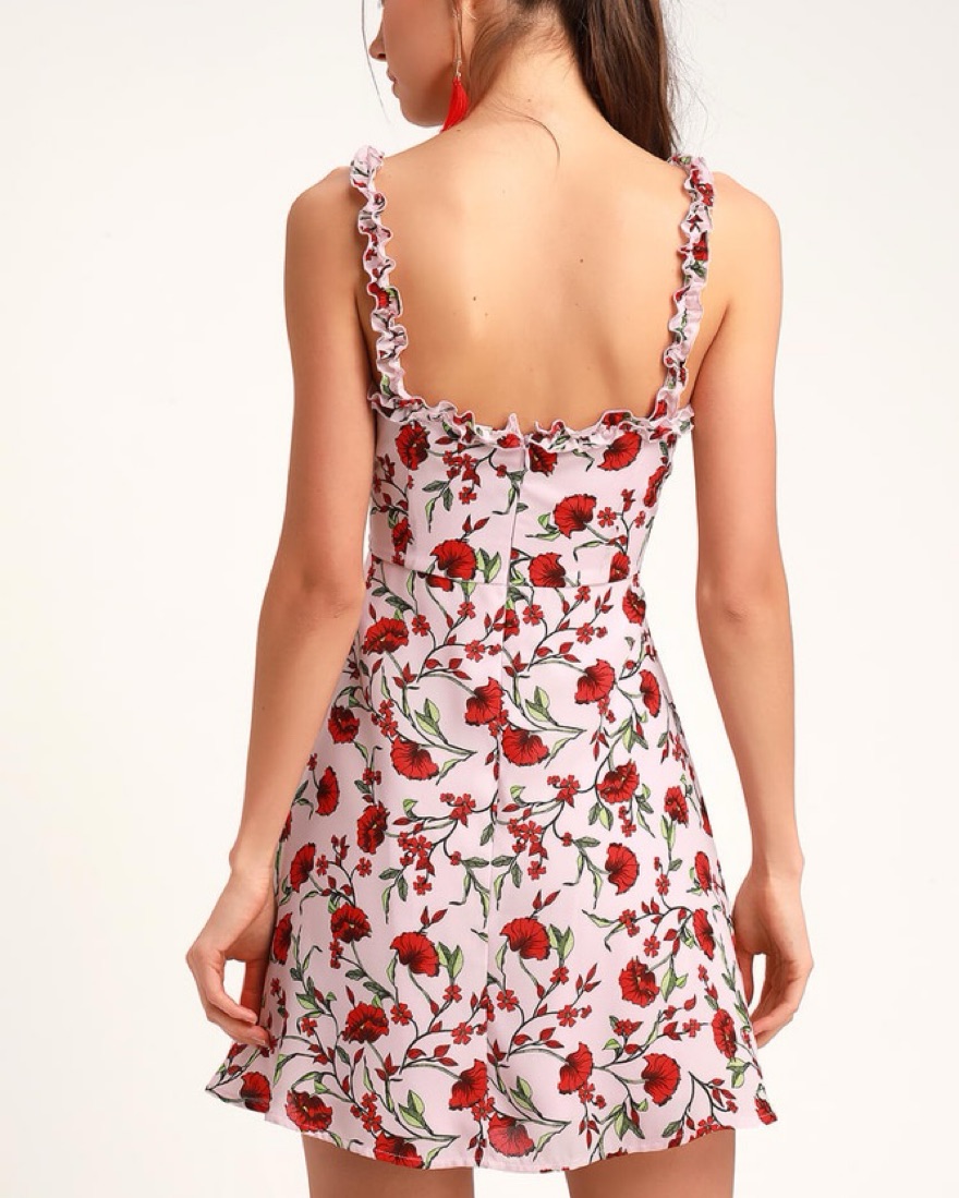 Style: flower moves blush pink floral print skater dress; ruffle spaghetti straps and zipper down the back