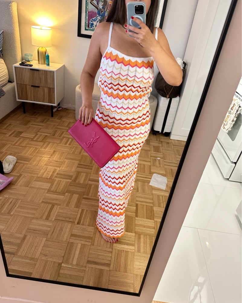 This eye-catching maxi dress with a bold chevron pattern is perfect for summer events and vacations. The vibrant color palette and flowing silhouette create a stylish and comfortable look.