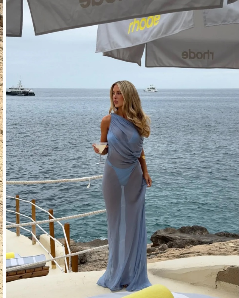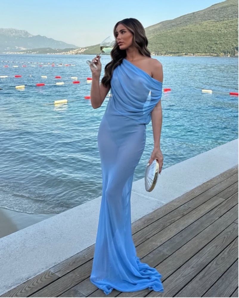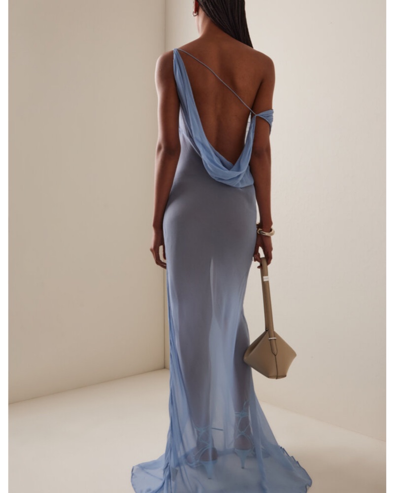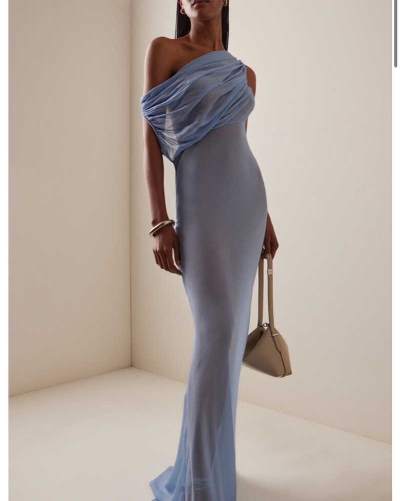 I originally ordered this as a high end resort cover up but now that I’ve seen it in person she’s def a night out showstopper! Crafted from sheer light blue viscose that moves like liquid. Airy and ethereal, Jordana is a made for golden hours, events that need a statement gown, or dream vacations.