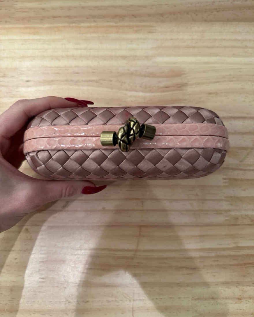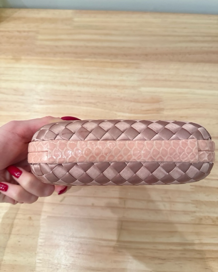 Shiny pink woven clutch with suede lining with bronze clasp. L 6.5 x H 4 opens to 3.5 in.
