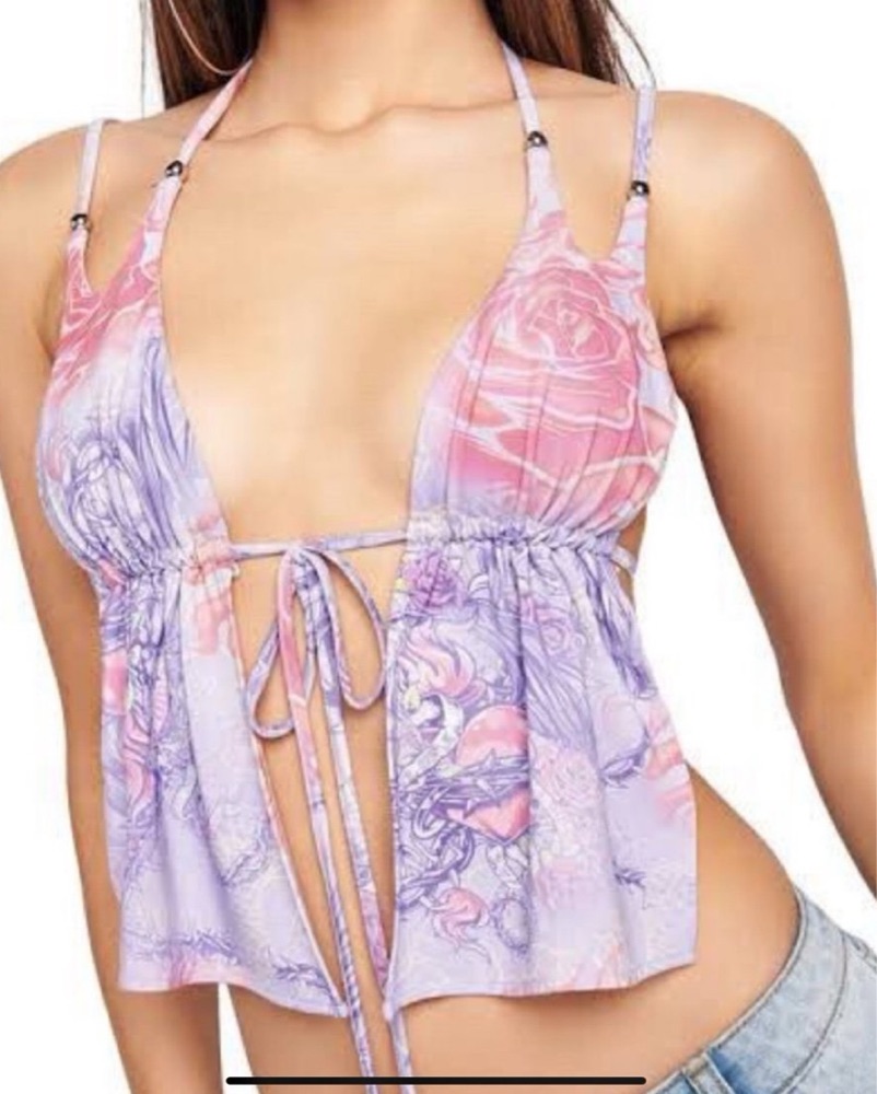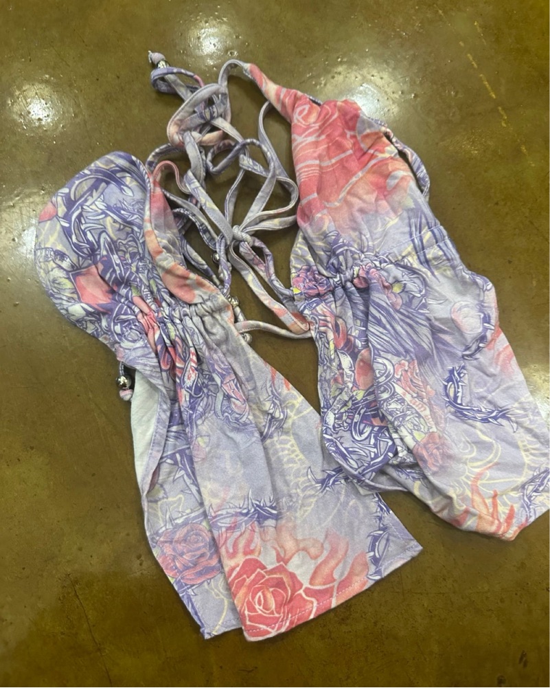 This cute but sexy crop top is backless with metal beads on the straps. The lavender and pink rose pattern looks almost like a tattoo and would be so perfect for a summer night out — breezy and fun! Pair it with the matching bag on my profile as a set for 20% off or wear it alone!