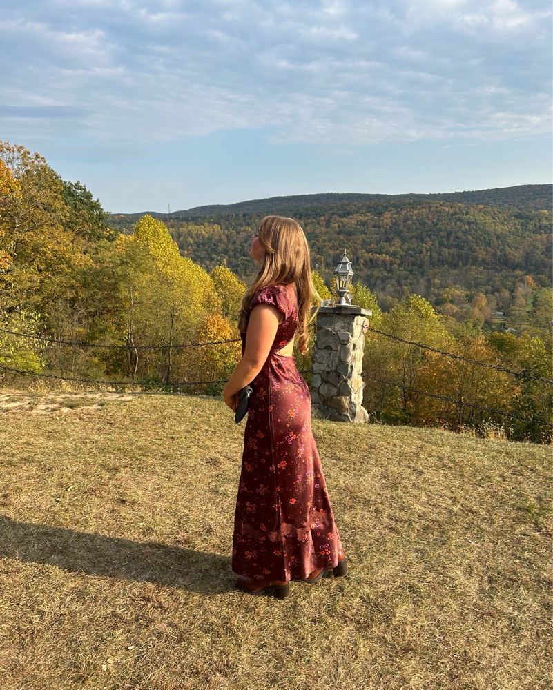Work once to a wedding - like new condition. Features a bubble puff sleeve, lace embellished sweetheart neckline, and brown floral pattern.