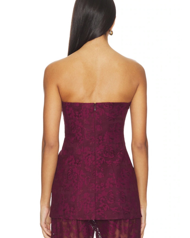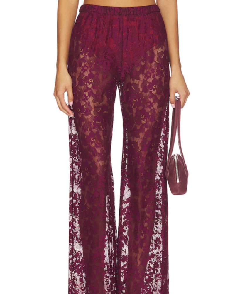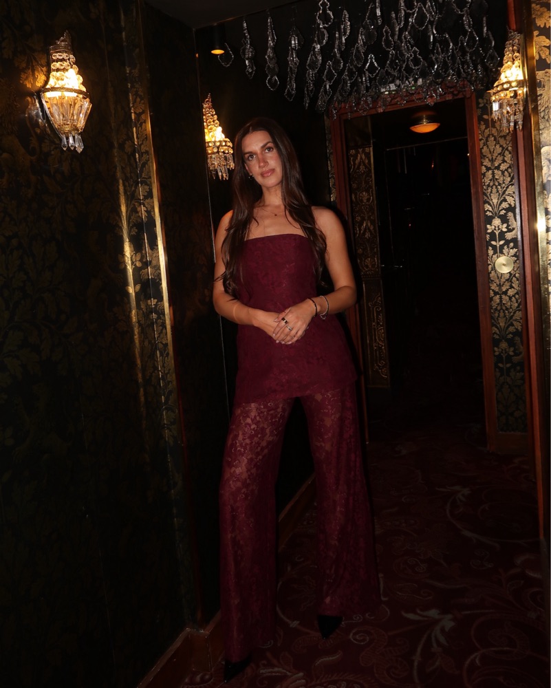 Color - wine Top - Self: 92% nylon, 8% spandex Lining: 100% polyester Hidden side zipper Pants - Self: 92% nylon, 8% spandex Lining: 100% polyester 20" at the leg opening