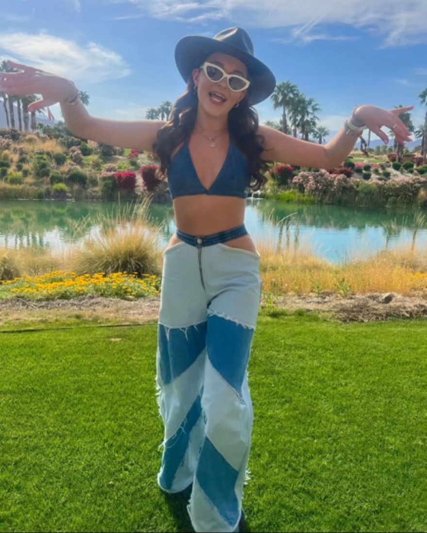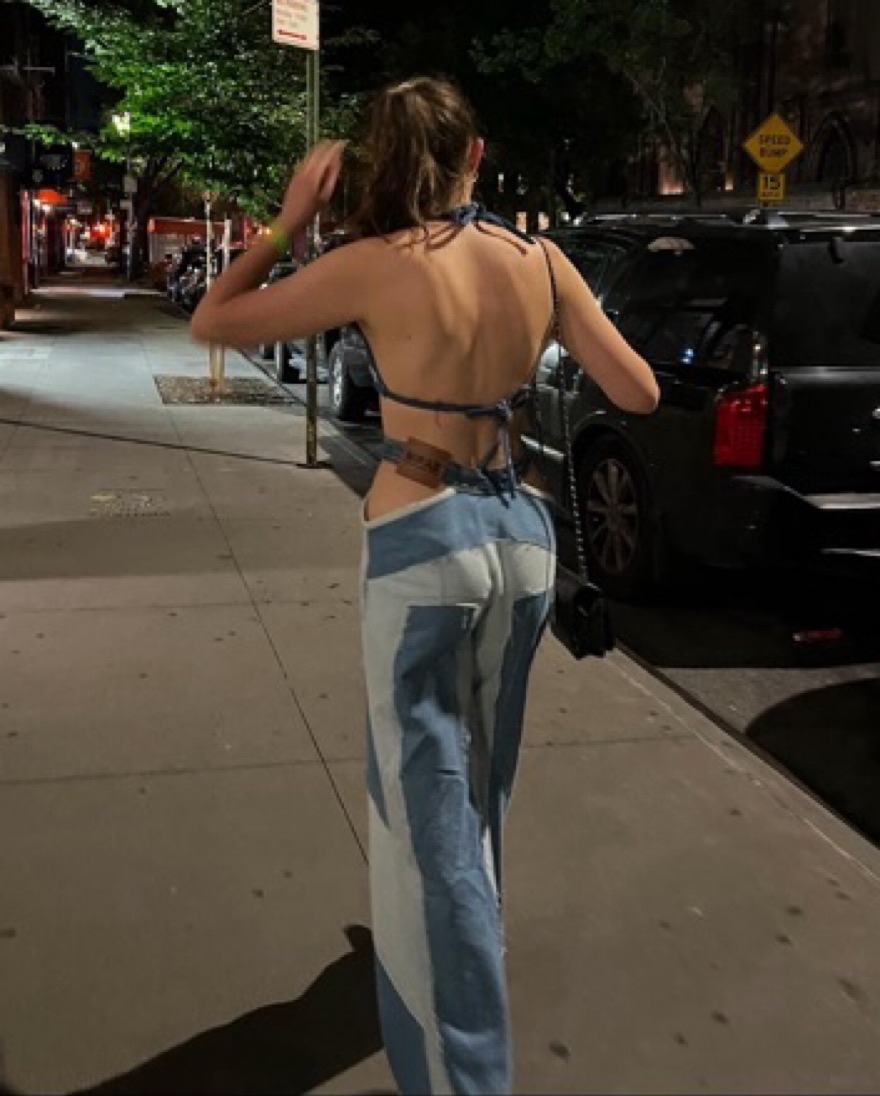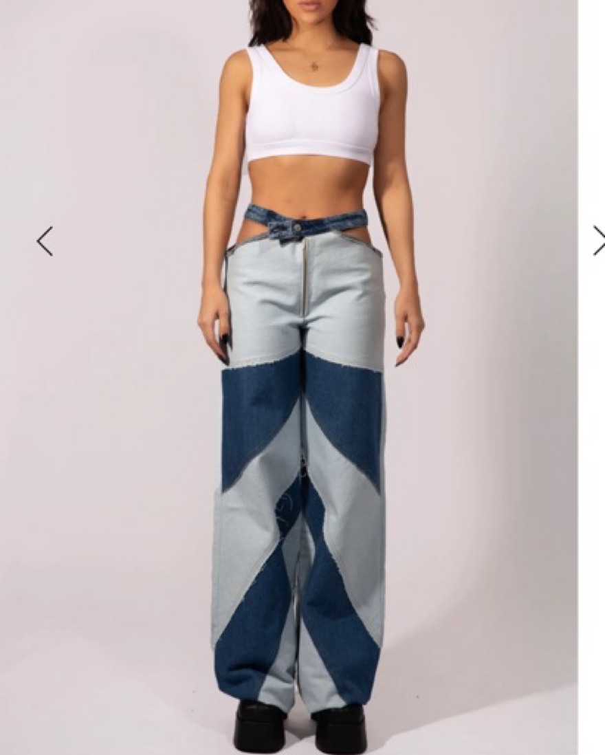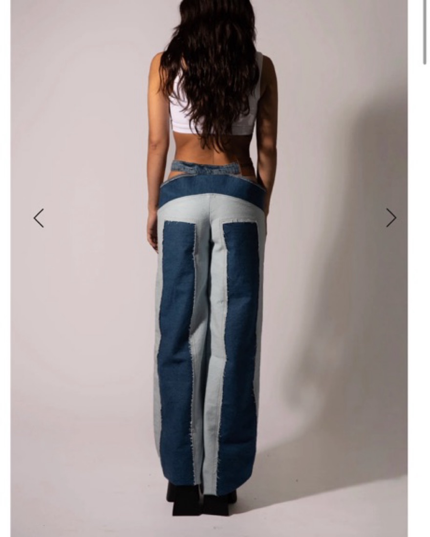 Coolest denim pacific cutout jeans and matching denim bralette from Mpaz Studios!! Both are size small. Can rent just the jeans, just the bralette or the set!