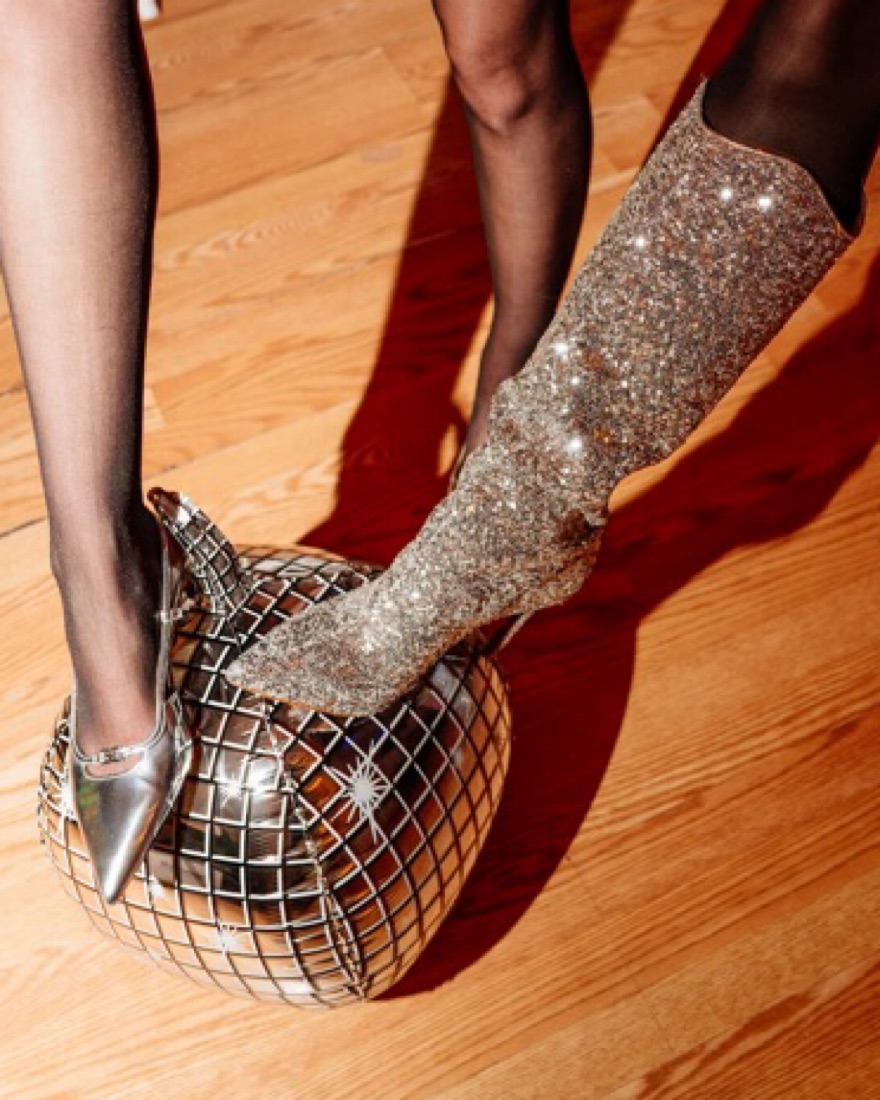 Statement boot. Taylor Swift inspired sparkly knee high boots. I wore to a Chappell Roan Pink Pony Club birthday party. I’m normally a size 8.5/9 and I was fine wearing these with socks