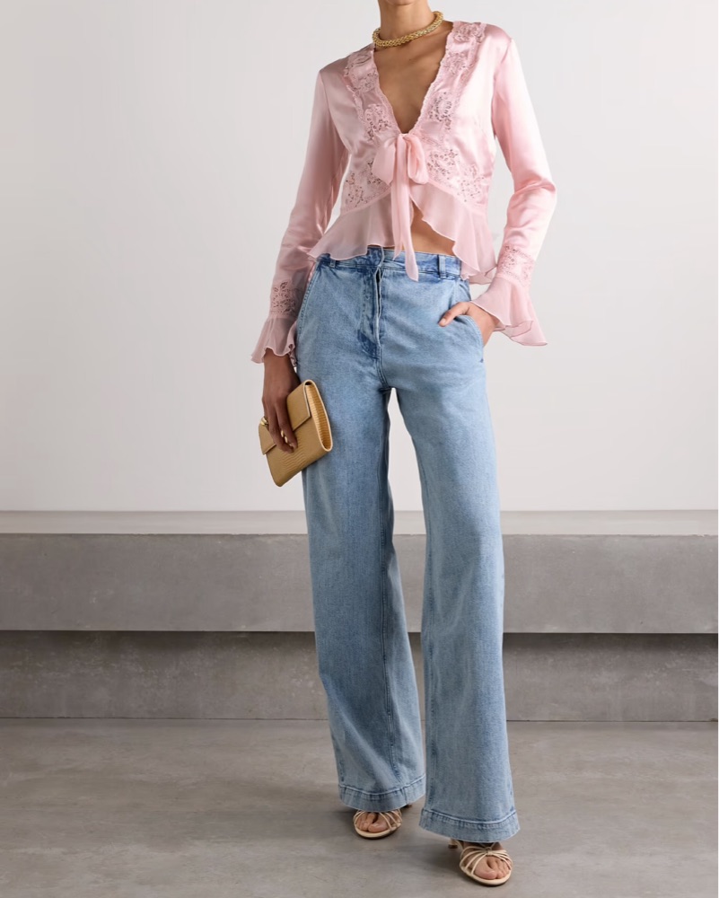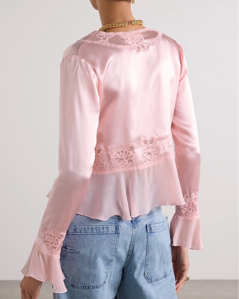 This gorgeous pink blouse with delicate lace accents and a flirty tie-front design is perfect for a romantic date night or a chic brunch with your girlies :)