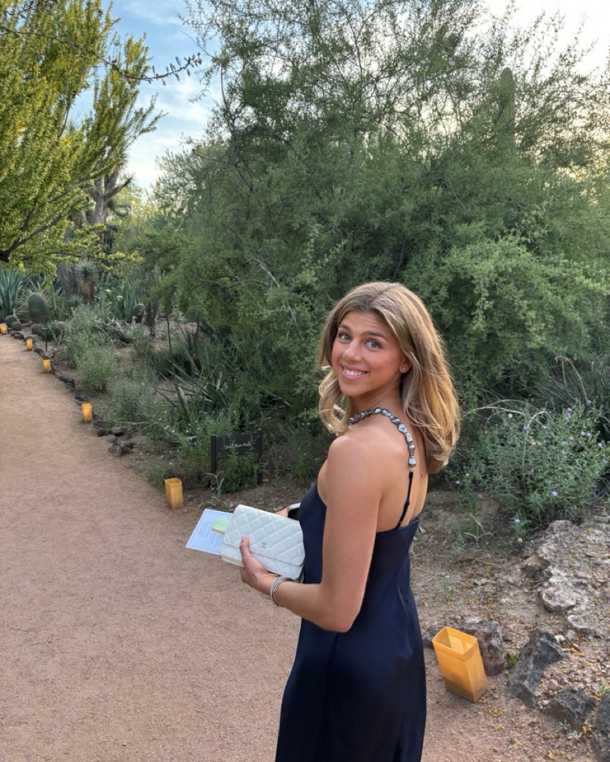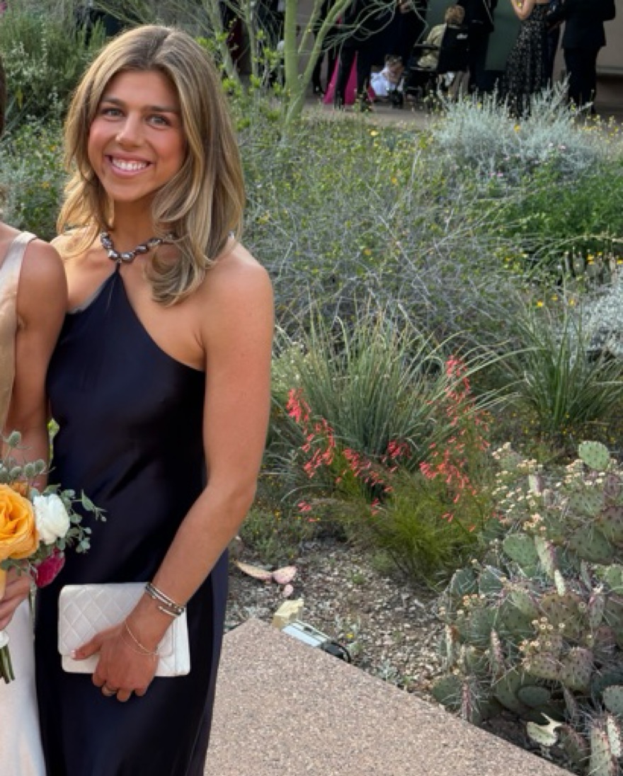 The Cadence is a floor length Navy dress featuring a halter neckline with beaded straps. This dress is crafted in satin and has a hidden back zipper.