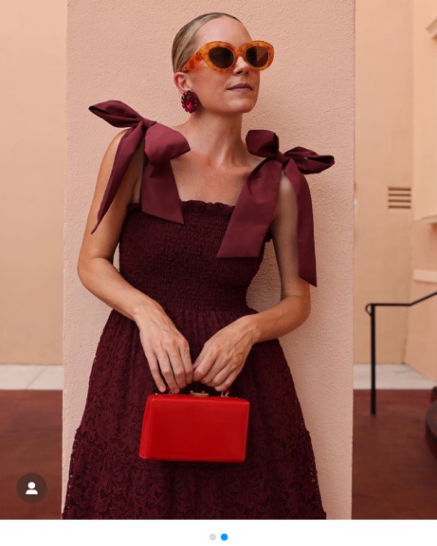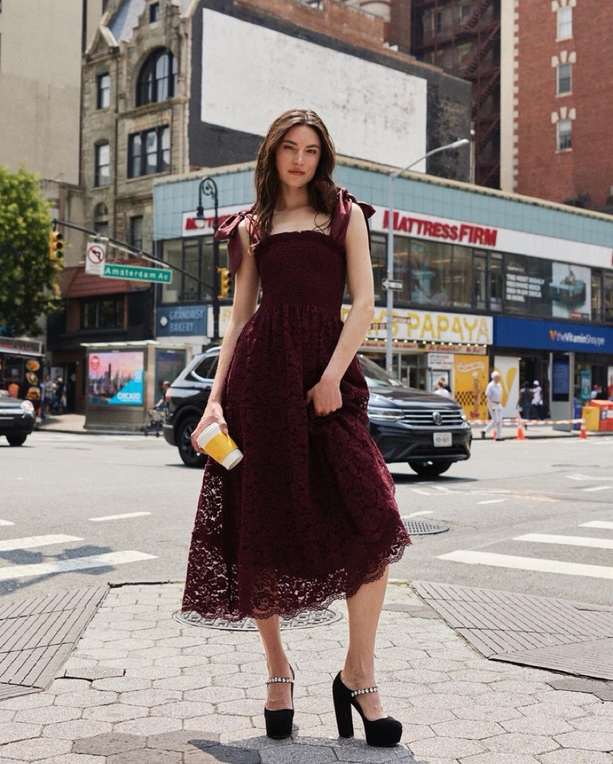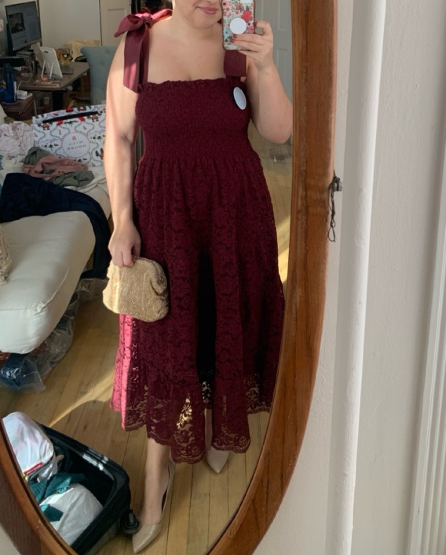 Burgundy lace ellie ribbon nap dress. Ribbon shoulder straps can be tied multiple ways. Smocked waist detail. Port lace color.