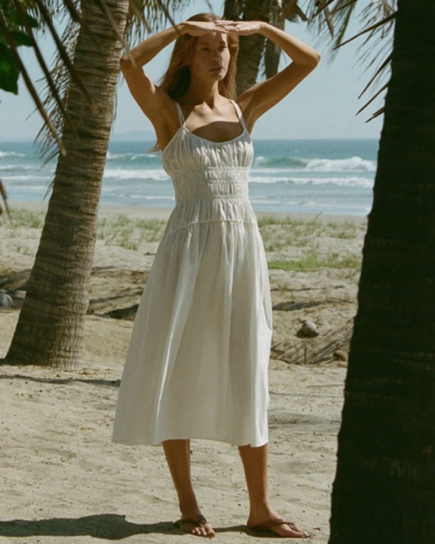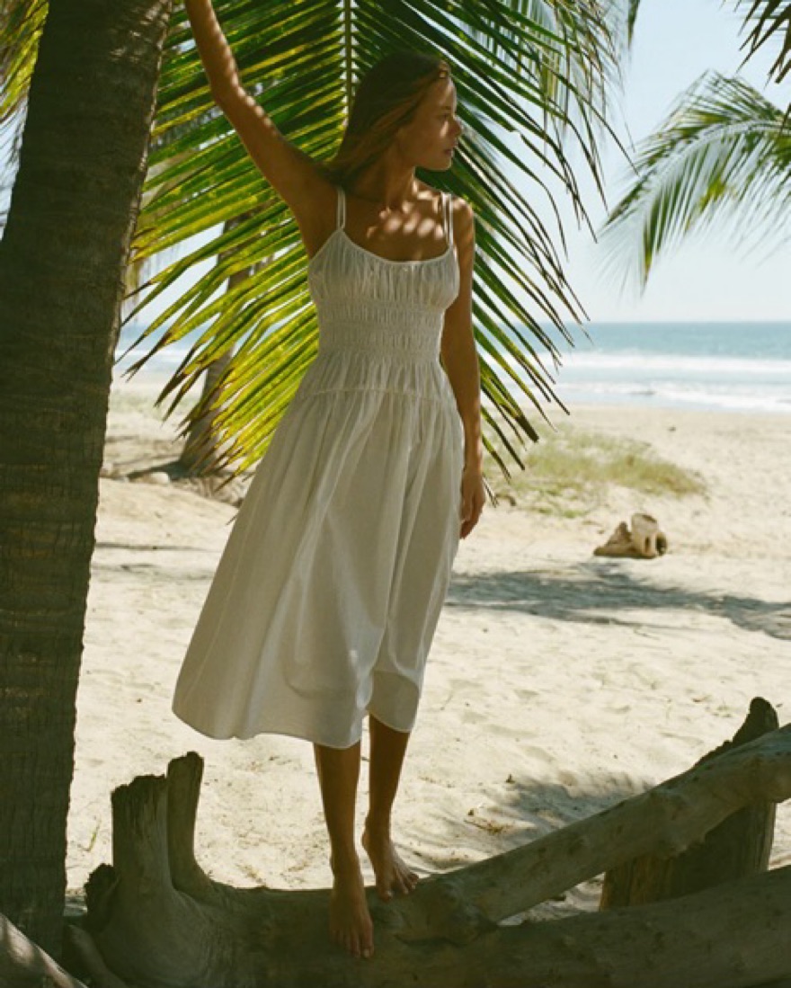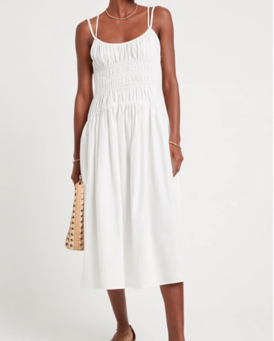 it fits true to size, i’m between size small and medium. cotton midi-length dress with adjustable straps that crisscross in the back. three rows of smocking and a tie back closure for one set of straps.