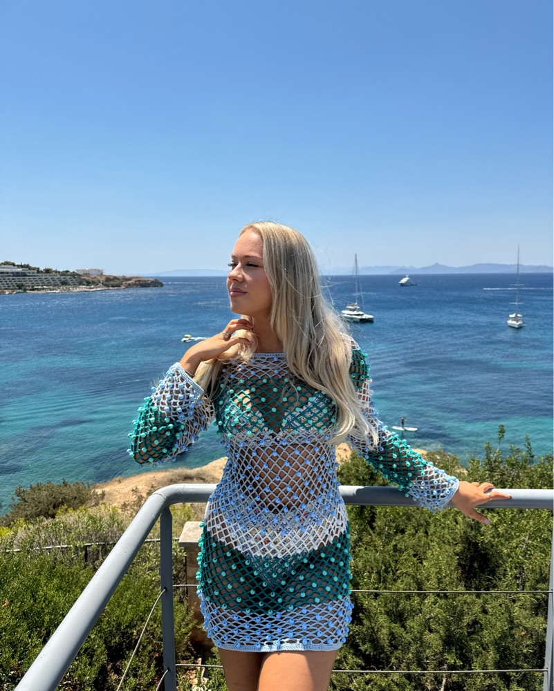 This stunning crochet dress is perfect for a beachside vacation. The vibrant teal and blue hues complement the shimmering crochet pattern, creating a truly eye-catching look.