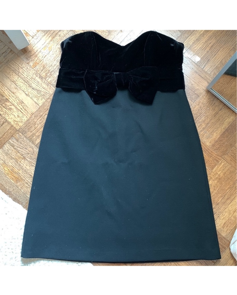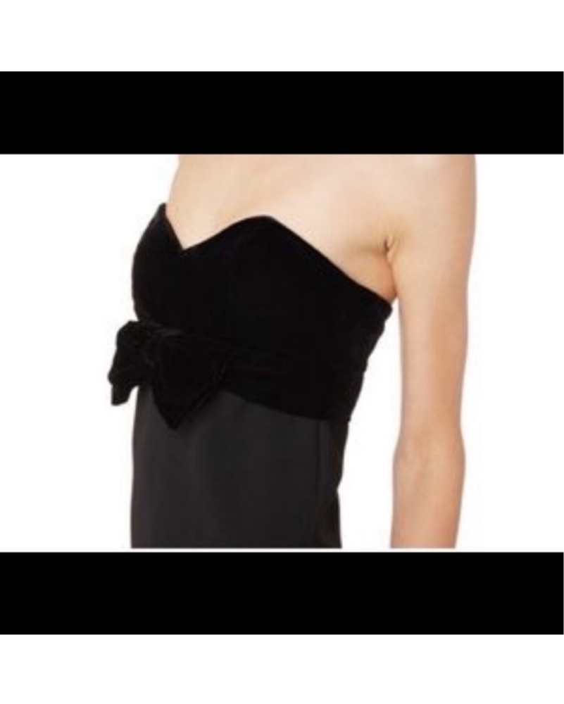 Fits like a true XS. Strapless with boning in place in the bust area. Velvet and bow detail on the top.