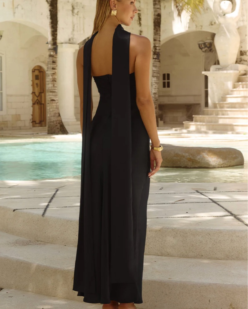 Strapless scarf maxi, has a super chic satin look to it. Definitely runs long, I’m 5’3 and it’s long on myself.