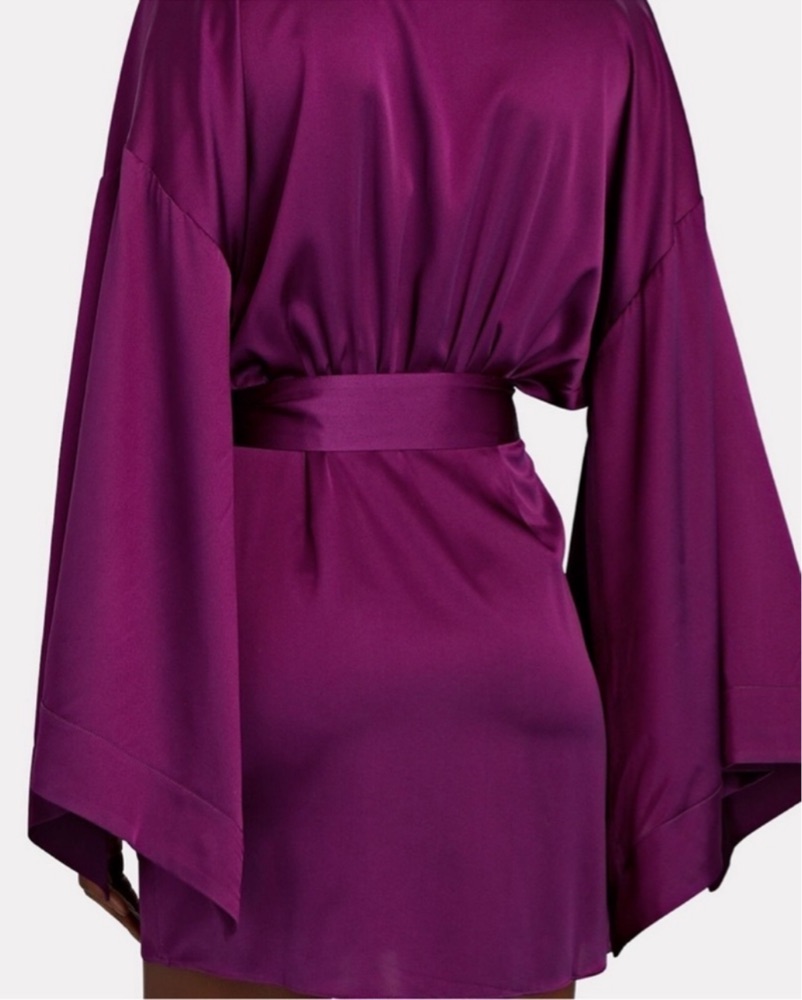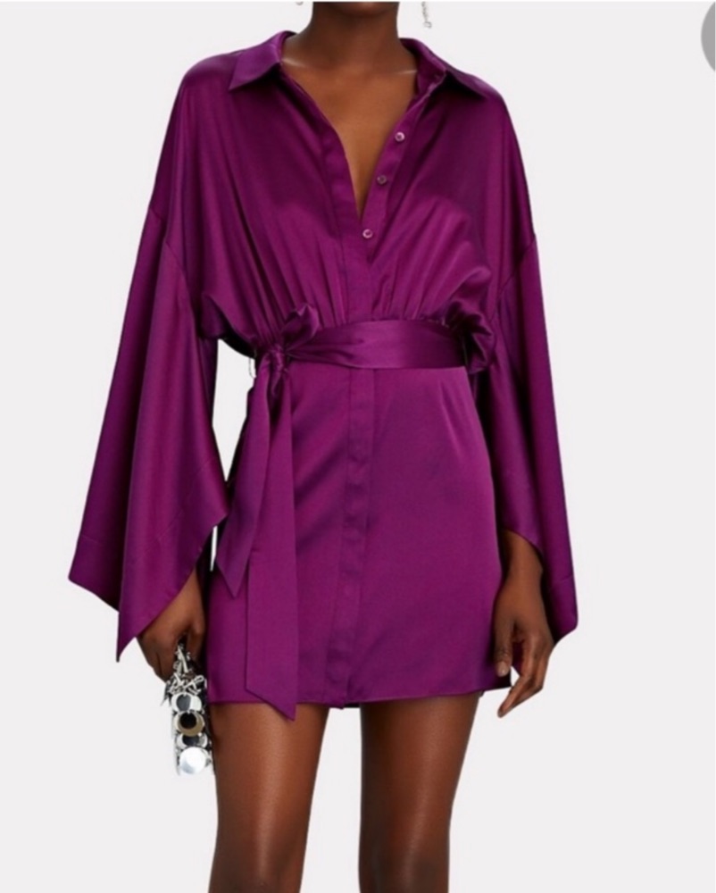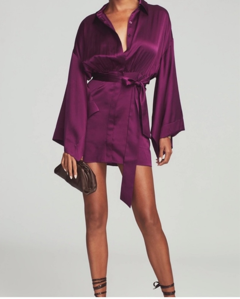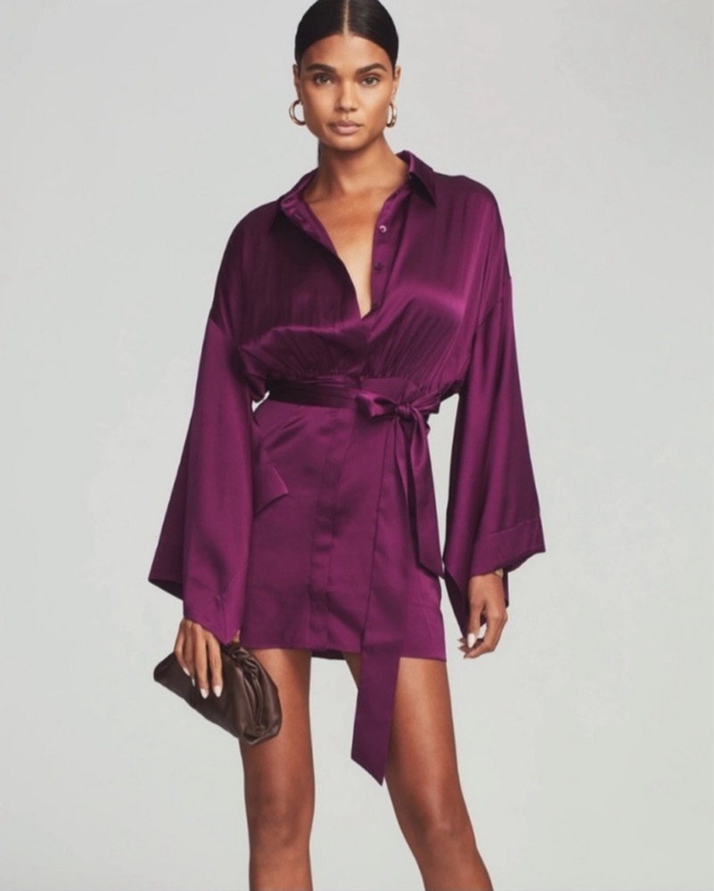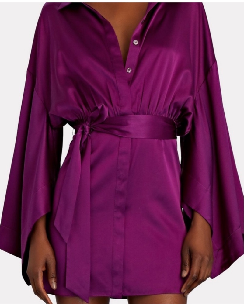 The Scottie Dress is a chic update on the classic shirt dress. Made from stretch-silk satin, the mini silhouette has long handkerchief sleeves and a matching tie belt that accentuates the waist. The style’s sexy yet sophisticated design makes for the perfect day-to-night dress. Shown here in plum