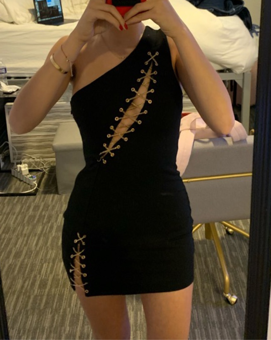 Black one shoulder mini dress with gold metal lace up details. So cooll and comfortable for any going out occassion