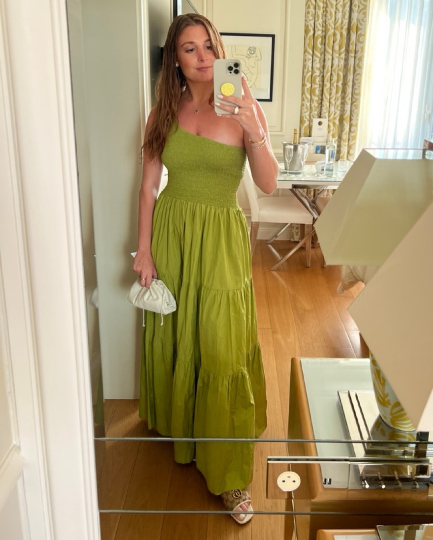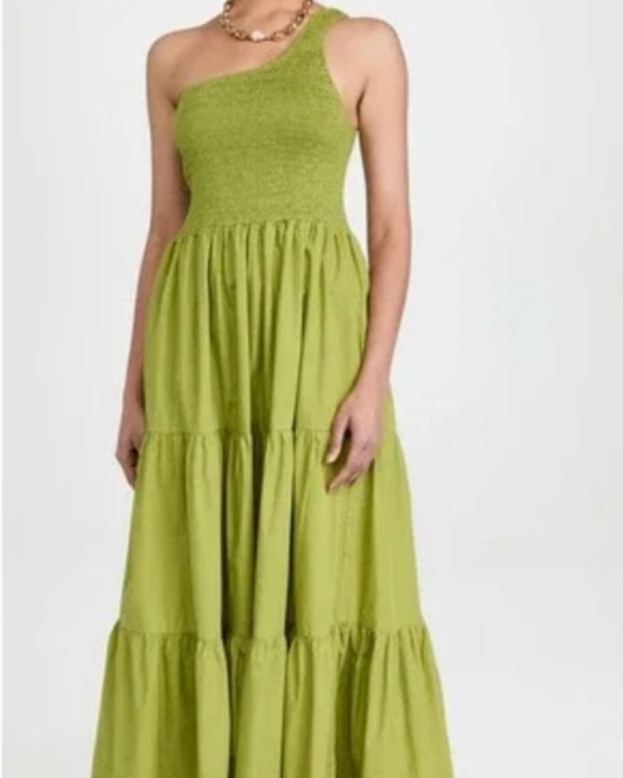 Smocked along a body-hugging one-shoulder, this maxi dress is tiered in a summery cotton poplin.