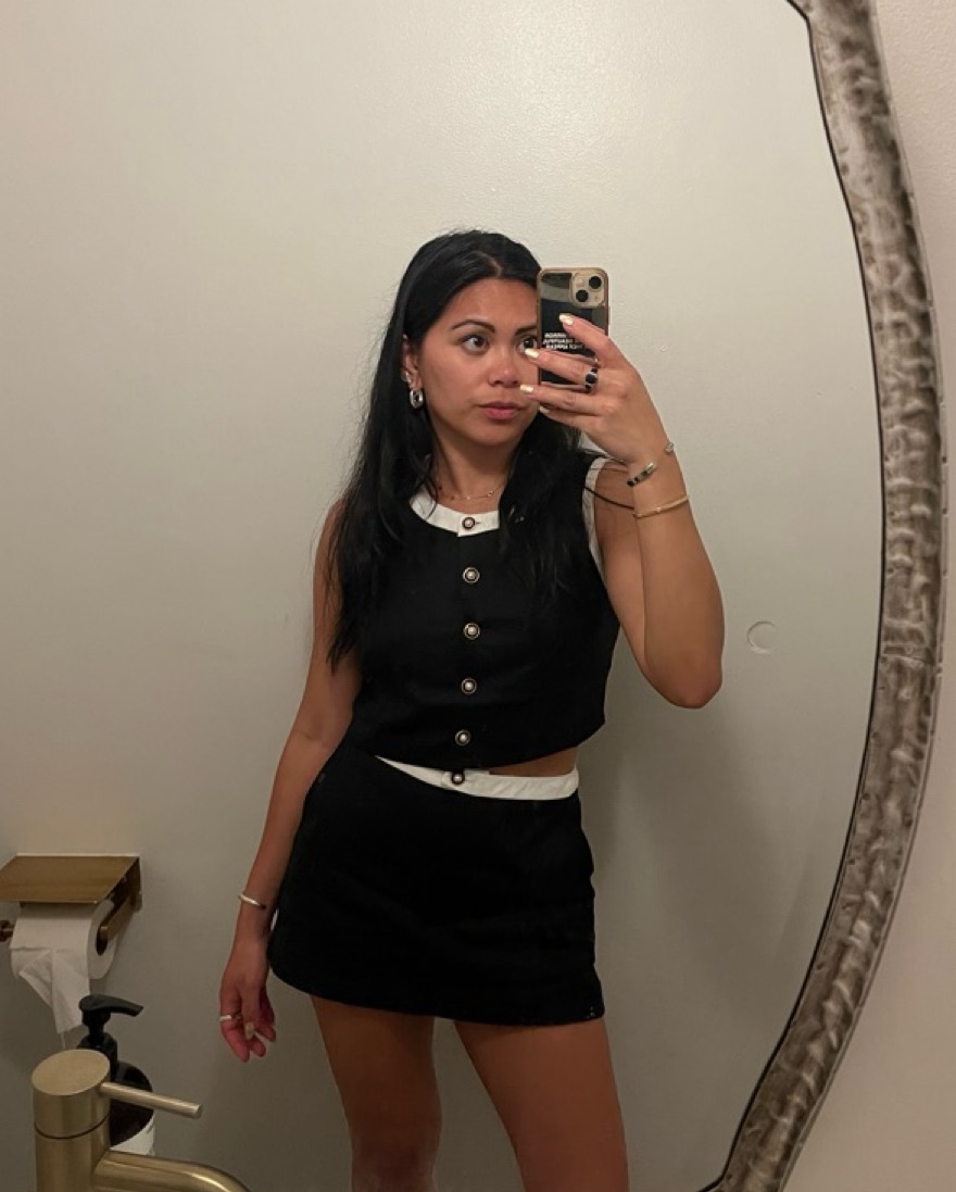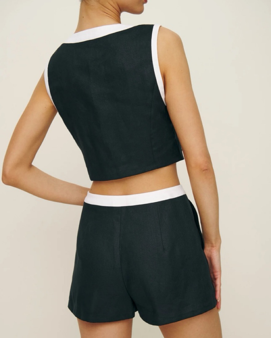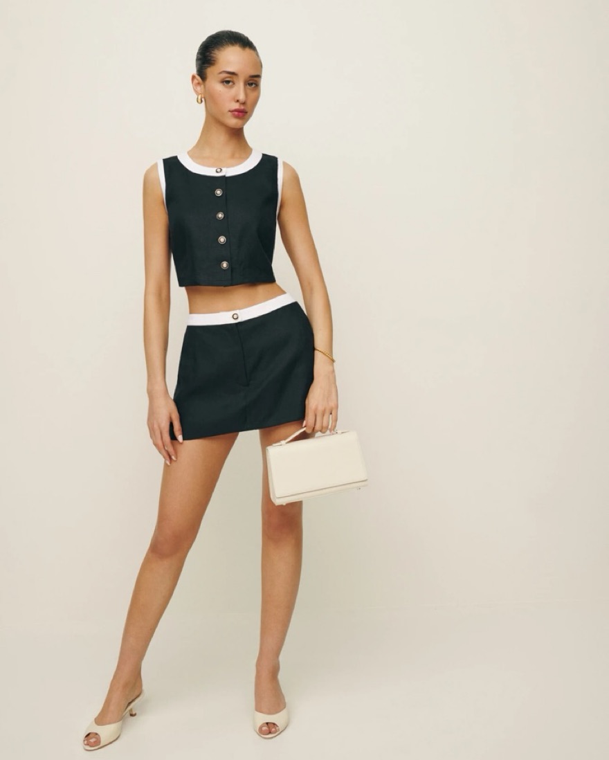 Linen two piece with cropped top and mini skort. Gold detail buttons. Super cute, lightweight, and always get compliments!