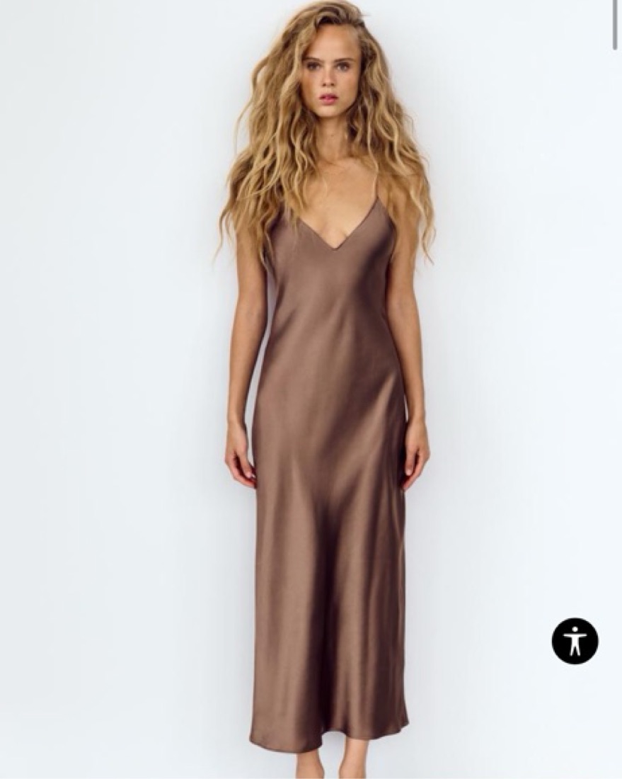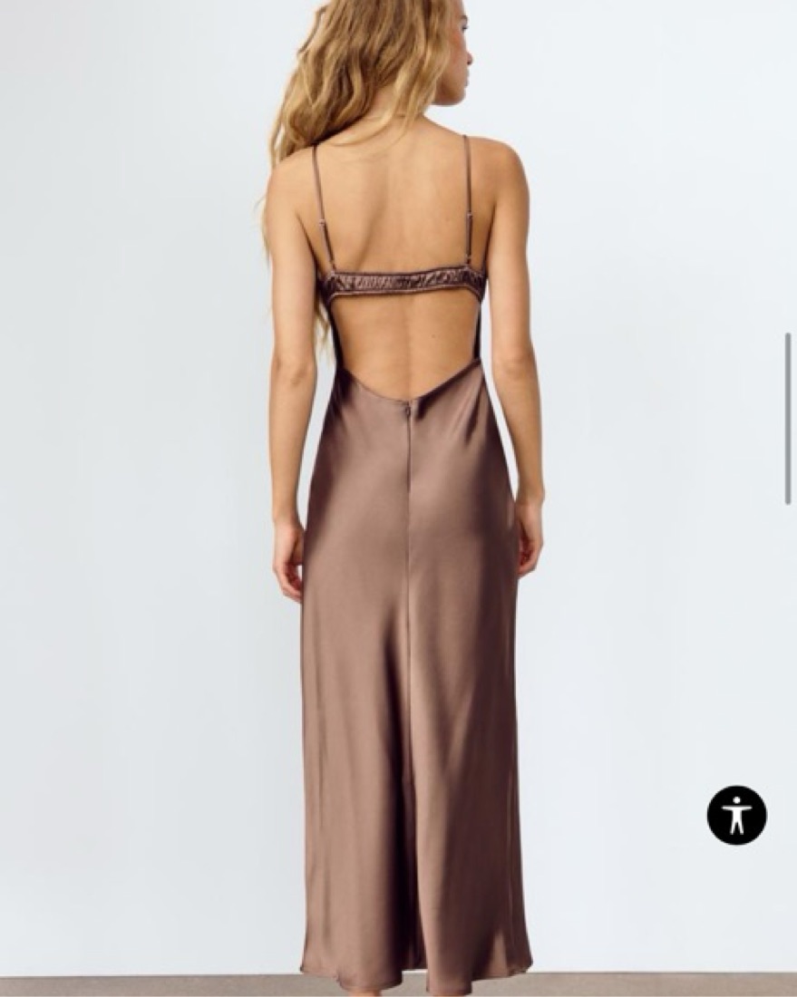 Brown satin Zara dress, perfrct legnth, open back with straps. Wore to a formal event and was perfect. Runs a bit small but straps are adjustable.
