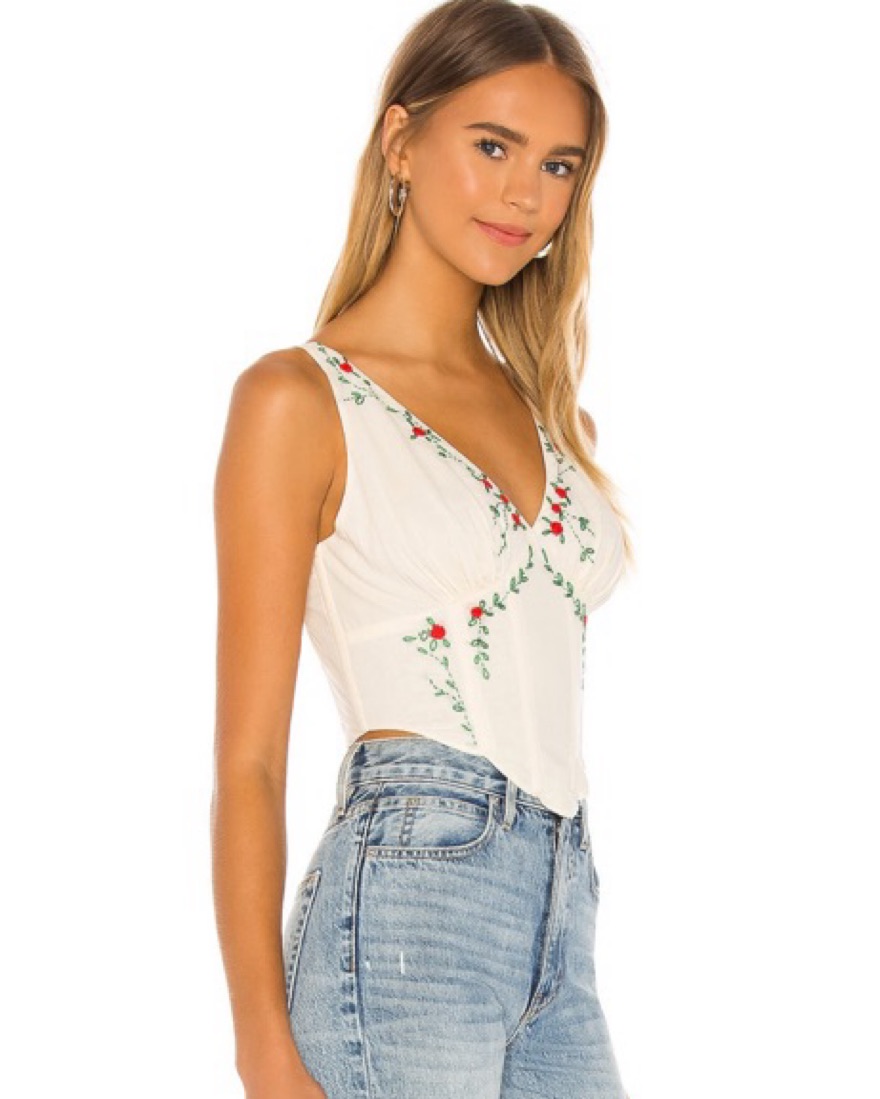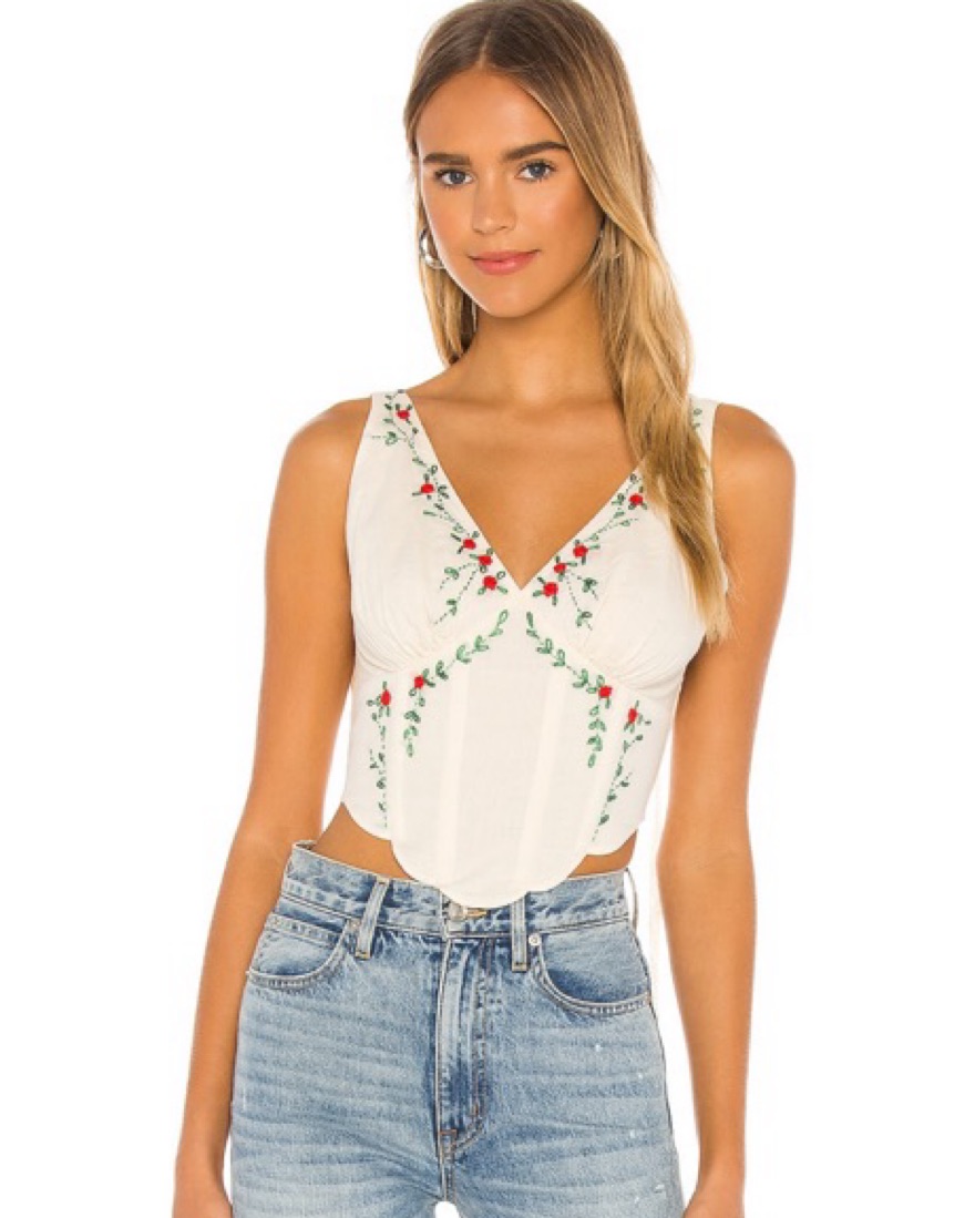 Embroidered corset top with red rose detail and tie back straps