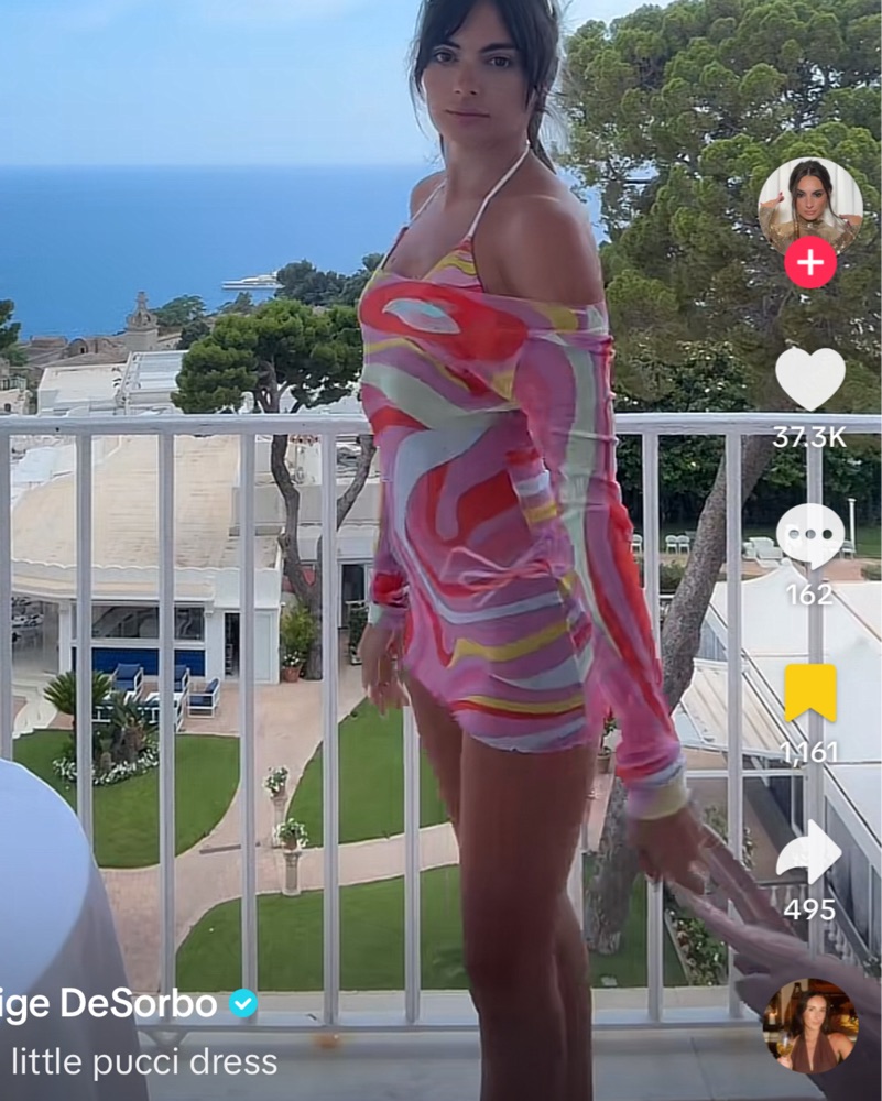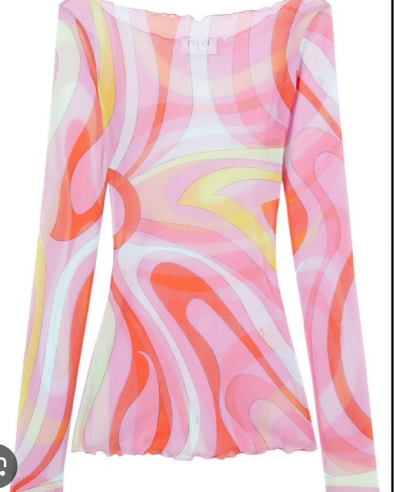 Top or Dress. Size FR 40. This is actually a Pucci top that some girls have pulled off the shoulder to wear as a beach cover up dress. It would fit a size XS - S but wouldn’t recommend for very tall girls (above 5’6). Printed tulle long sleeve top.