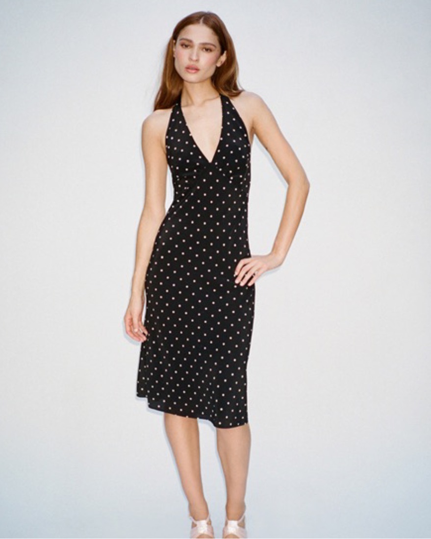 V-neck sleeveless halter dress Midi length Adjustable tie at neck Scooped open back No zip, slip on style Lined at bust No need to wear a bra