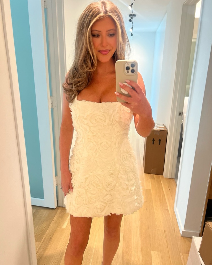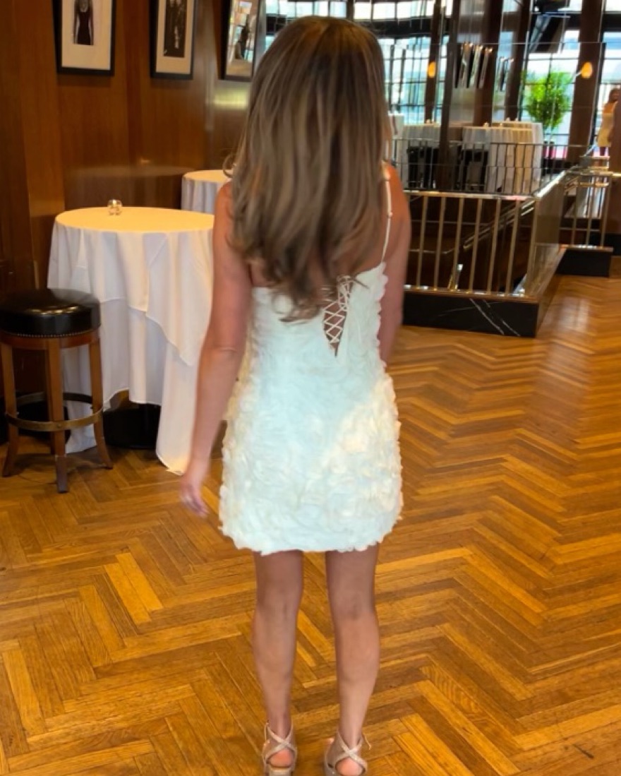 Ivory/white floral appliqué mini dress. Worn once for bridal shower! Build in corset for adjustable bust size. Height 5’3 and it’s perfectly!