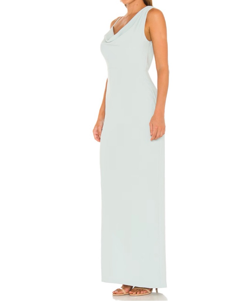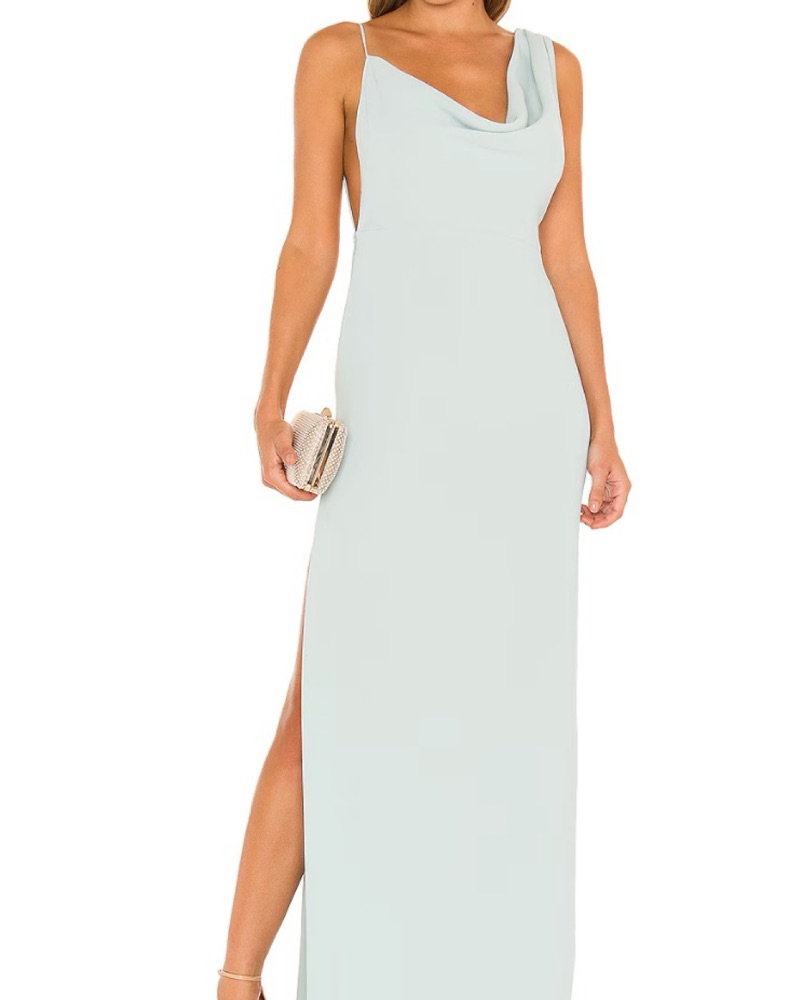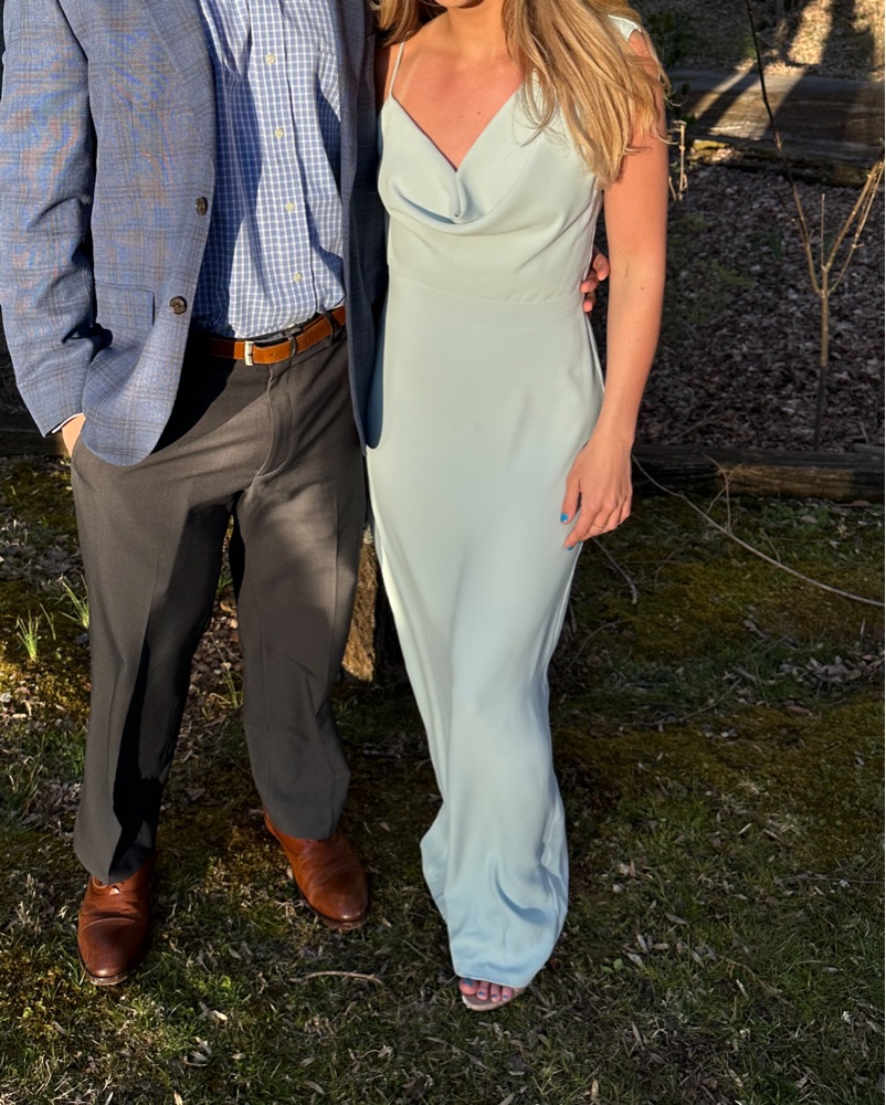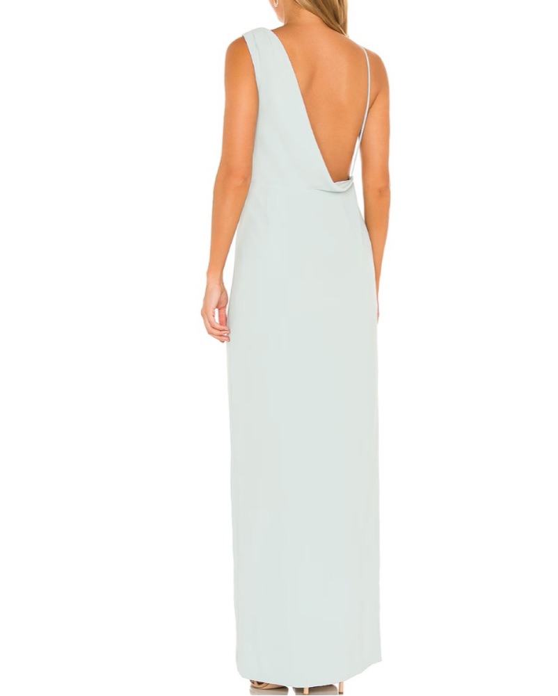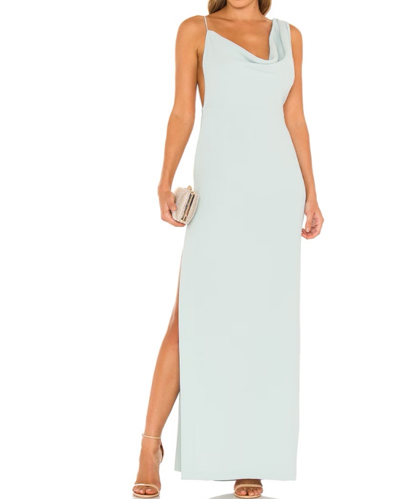 Light blue long dress by Amanda Uprichard, purchased from Revolve. For reference, I am 5’1” in the last photo. Comfortable dress that is the perfect wedding guest dress!