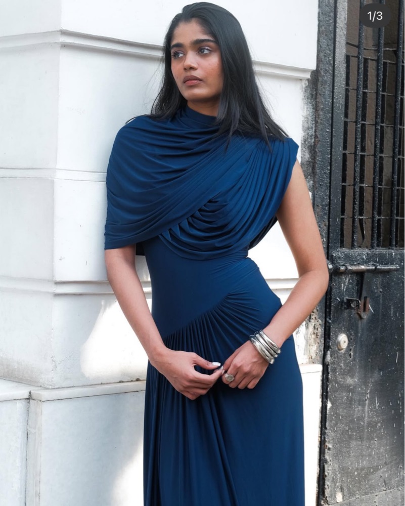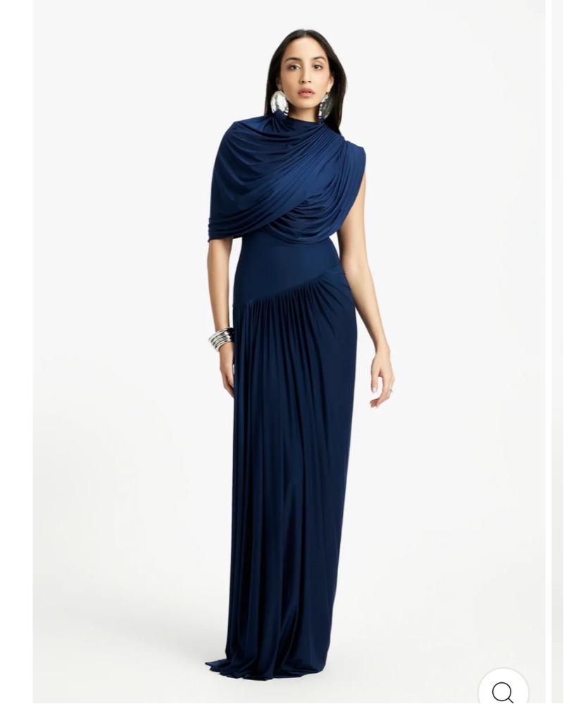 Brand new. This captivating dress boasting a fully draped top and bottom, adorned with intricate pleated drapes for added texture and dimension. The artful draping creates a sense of movement and fluidity, while the pleated accents add a touch of sophistication and elegance.