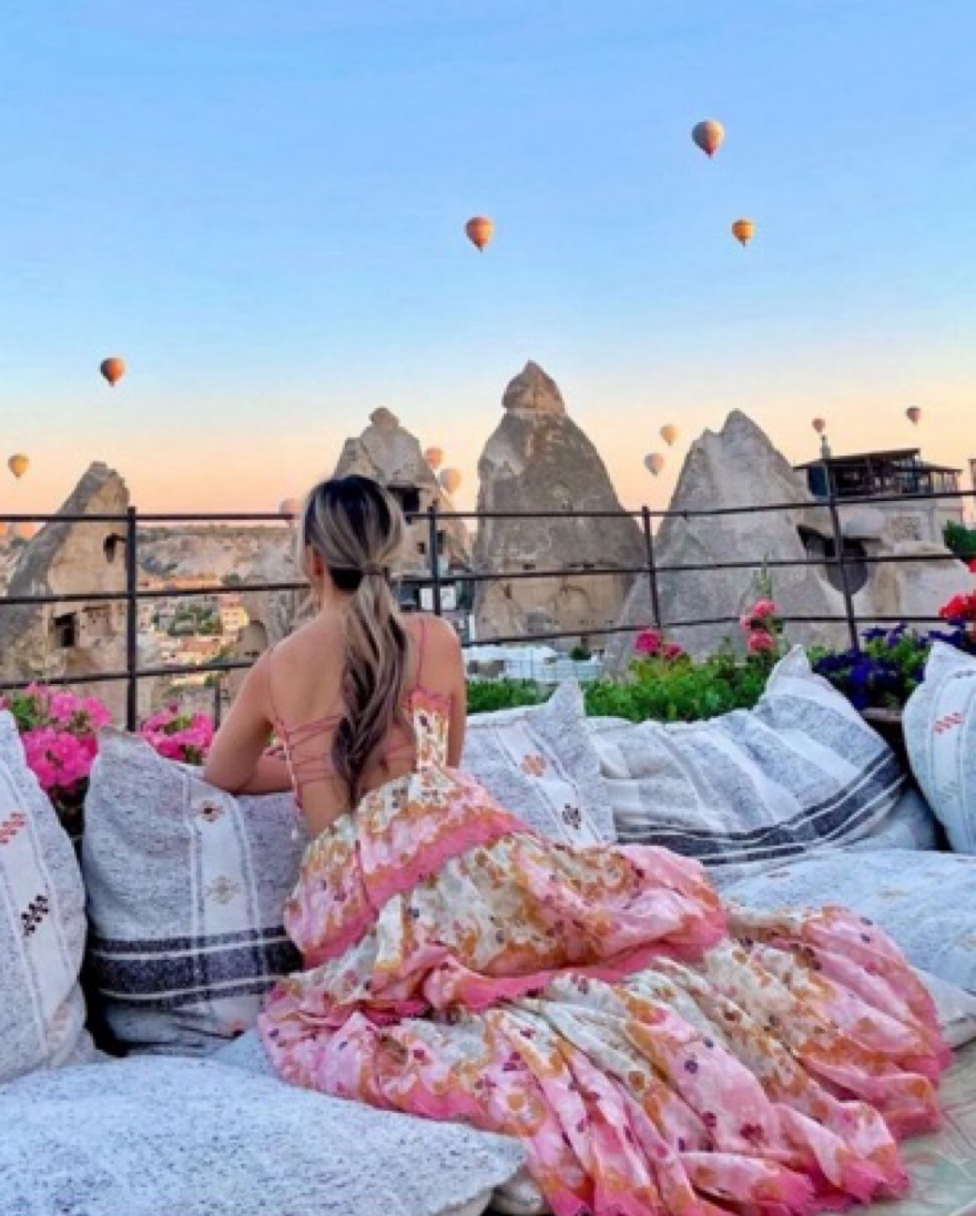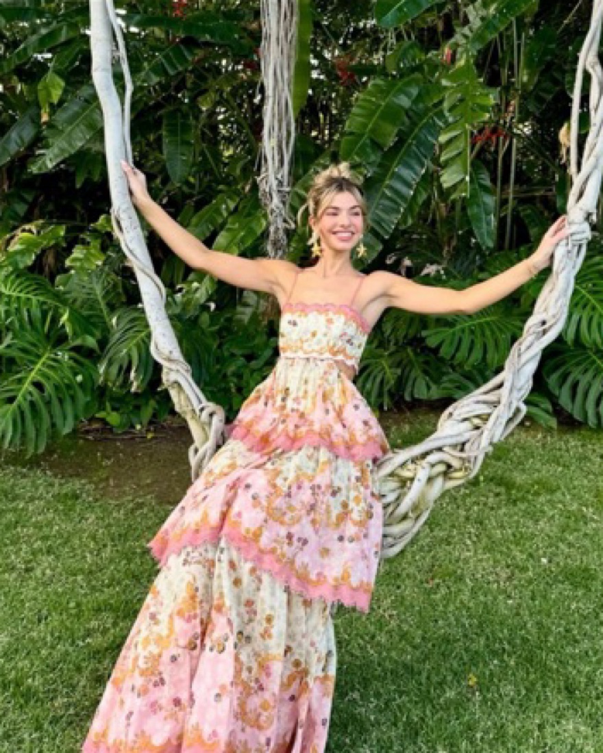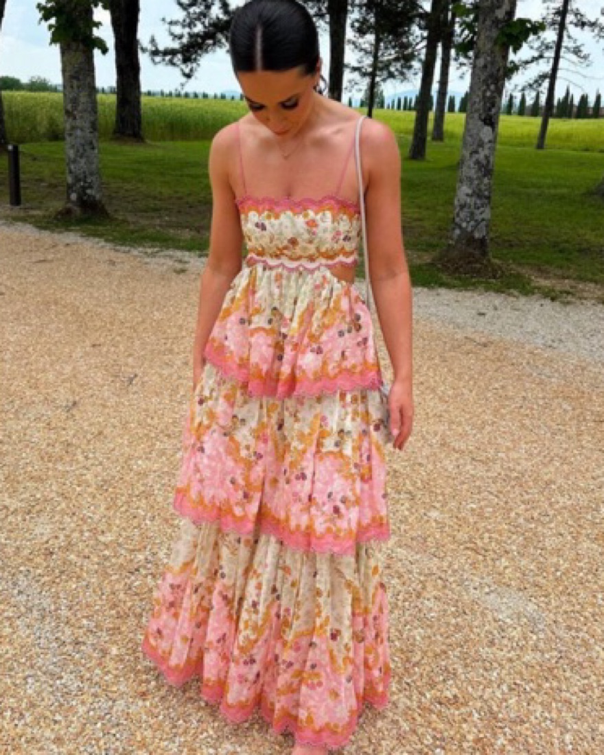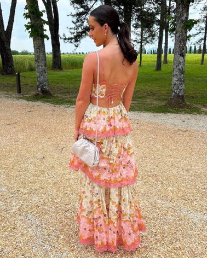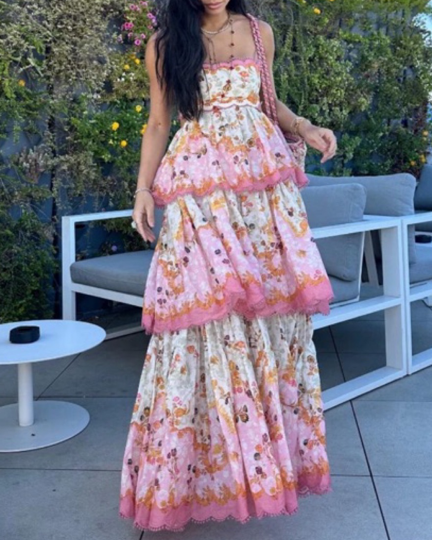 The Laurel Frill Midi Dress in Pink Floral from Zimmermann's Resort 2023 Collection. A cotton silk midi dress featuring scalloped tiers with lace trims and a cutaway waist, finished with a lace up back and adjustable straps. There is a tear at the back on the bottom hem but hidden