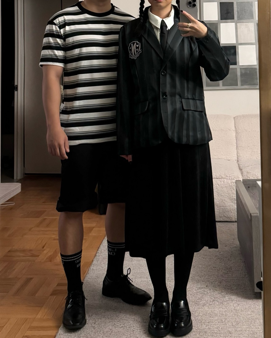 Can rent individually or together. If you want individual, DM me so I can create a separate listing. Includes Wednesday’s Blazer (size S/M) and Pugsley’s TShirt (size M/L) + Long Shorts (size 32x35 elastic waistband so flexible)