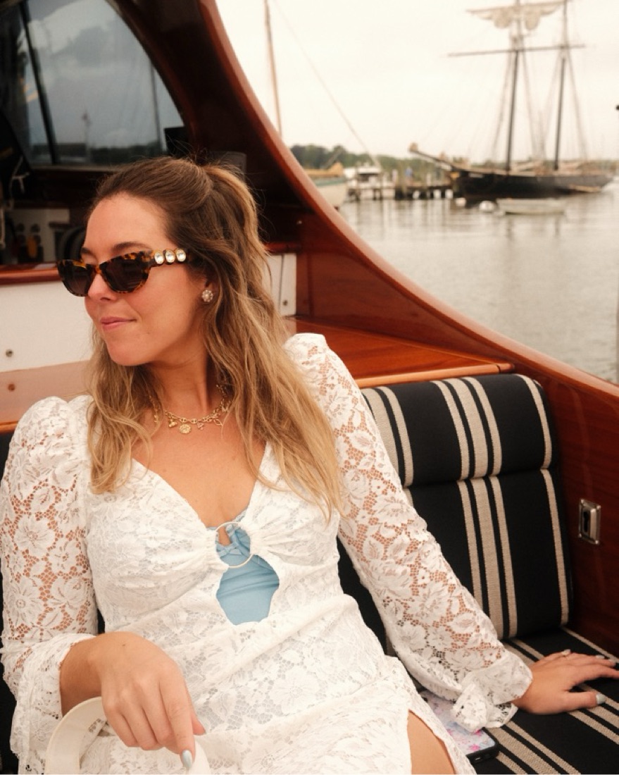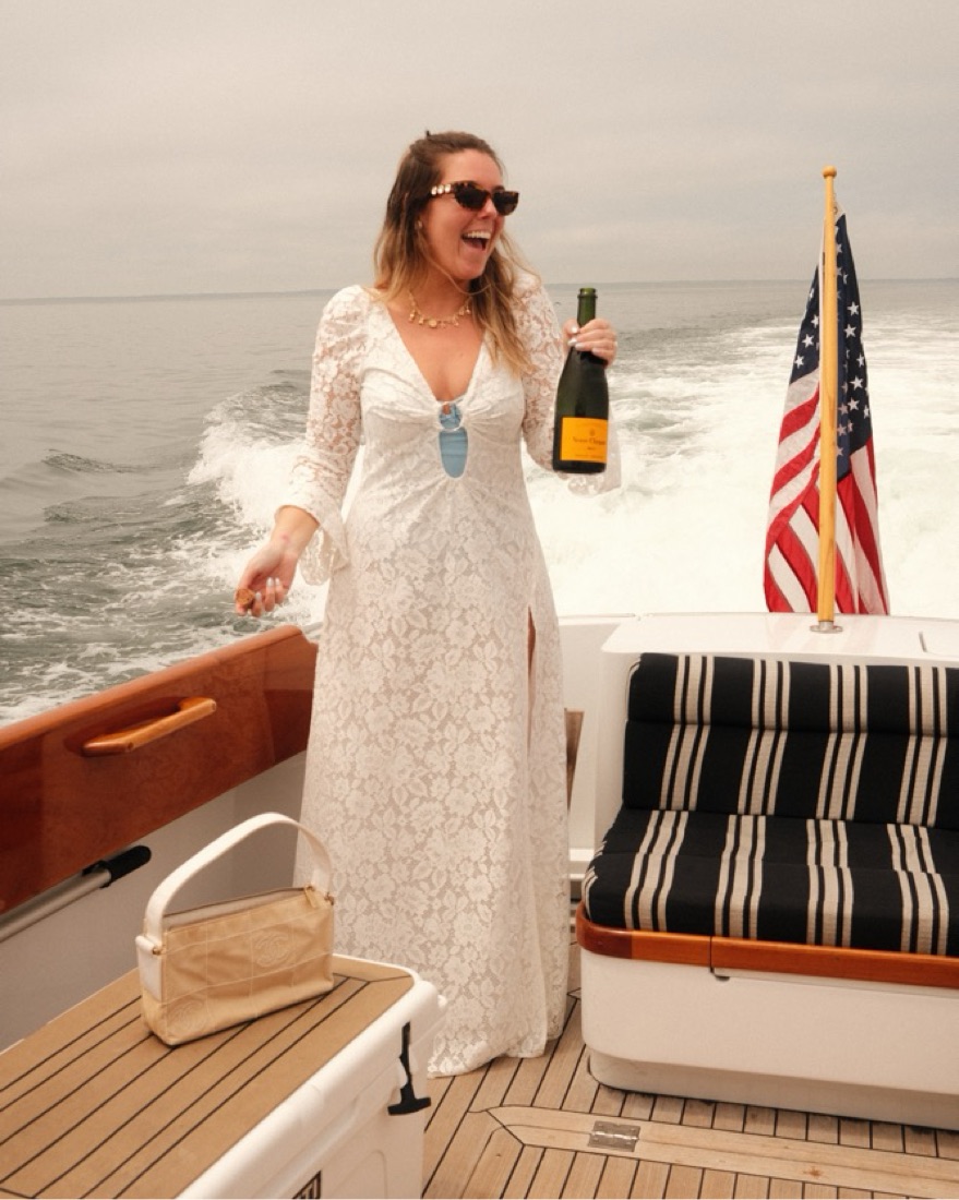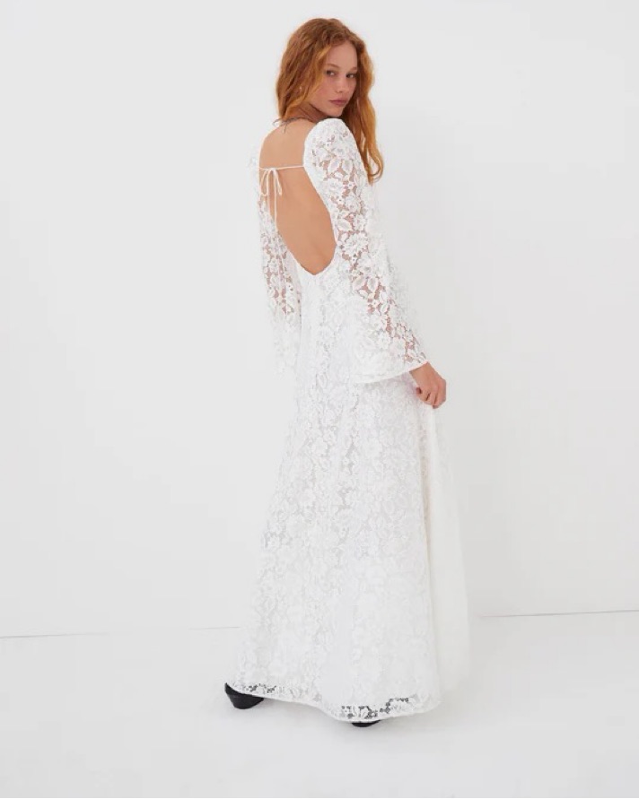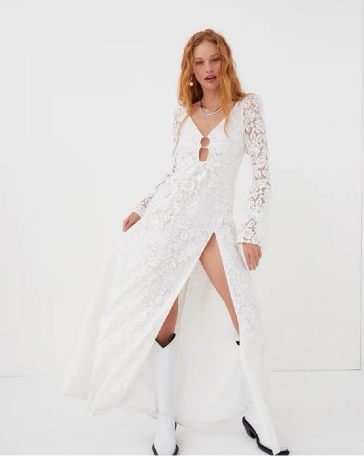 white lace maxi dress from for love and lemons with bell sleeves, leg slit, and ring detail at the front. perfect for summer!