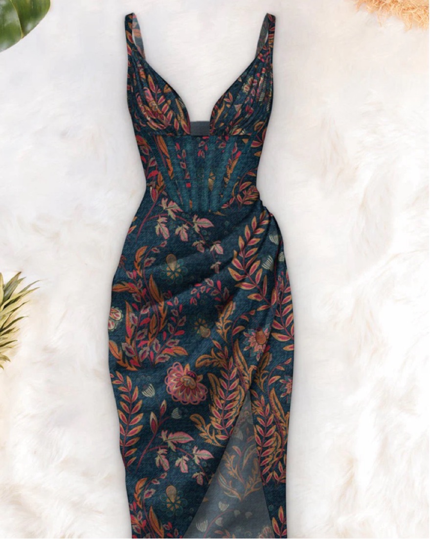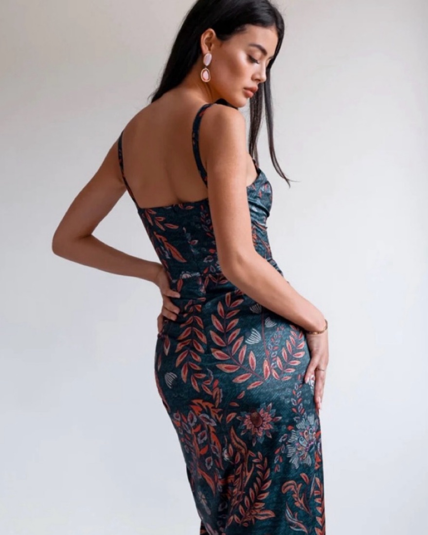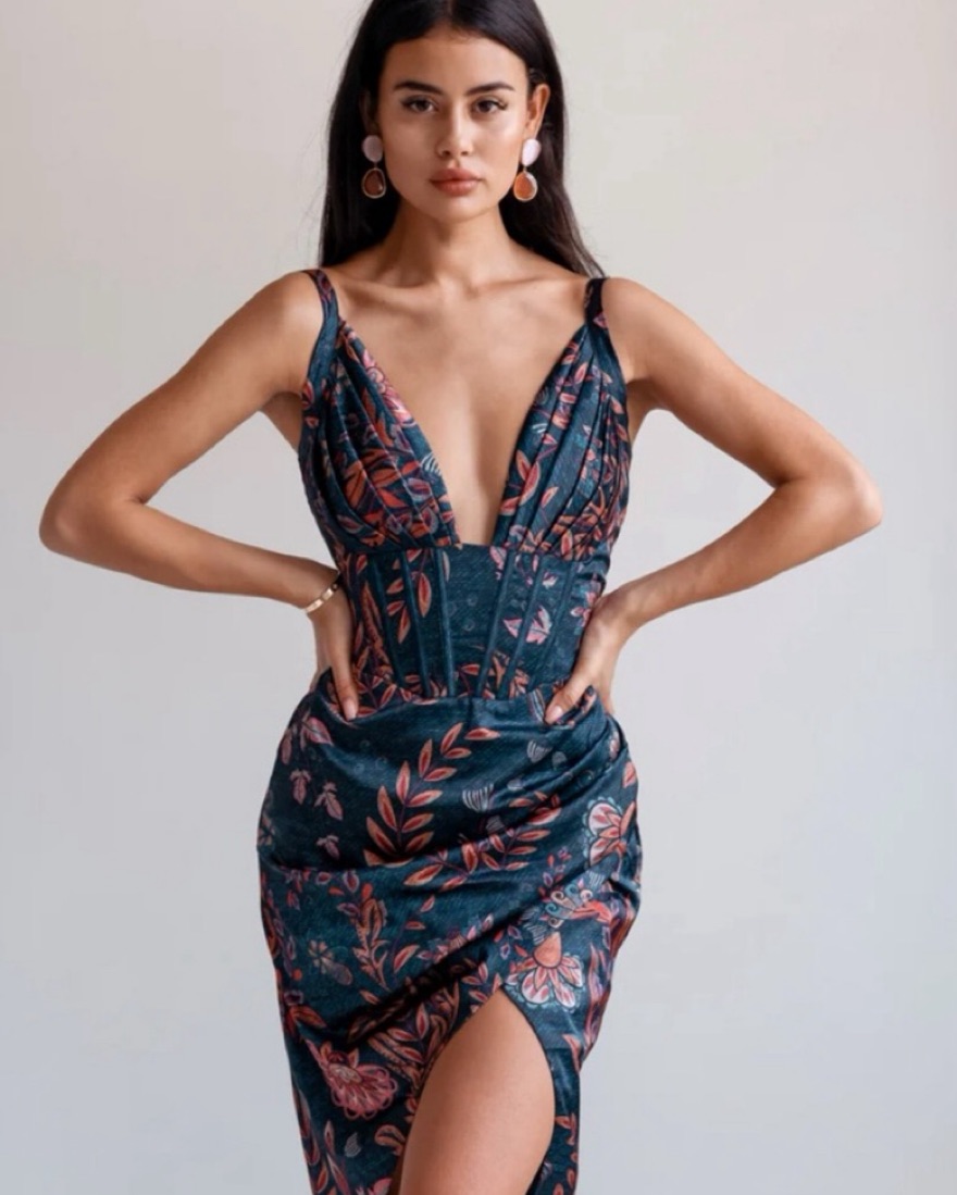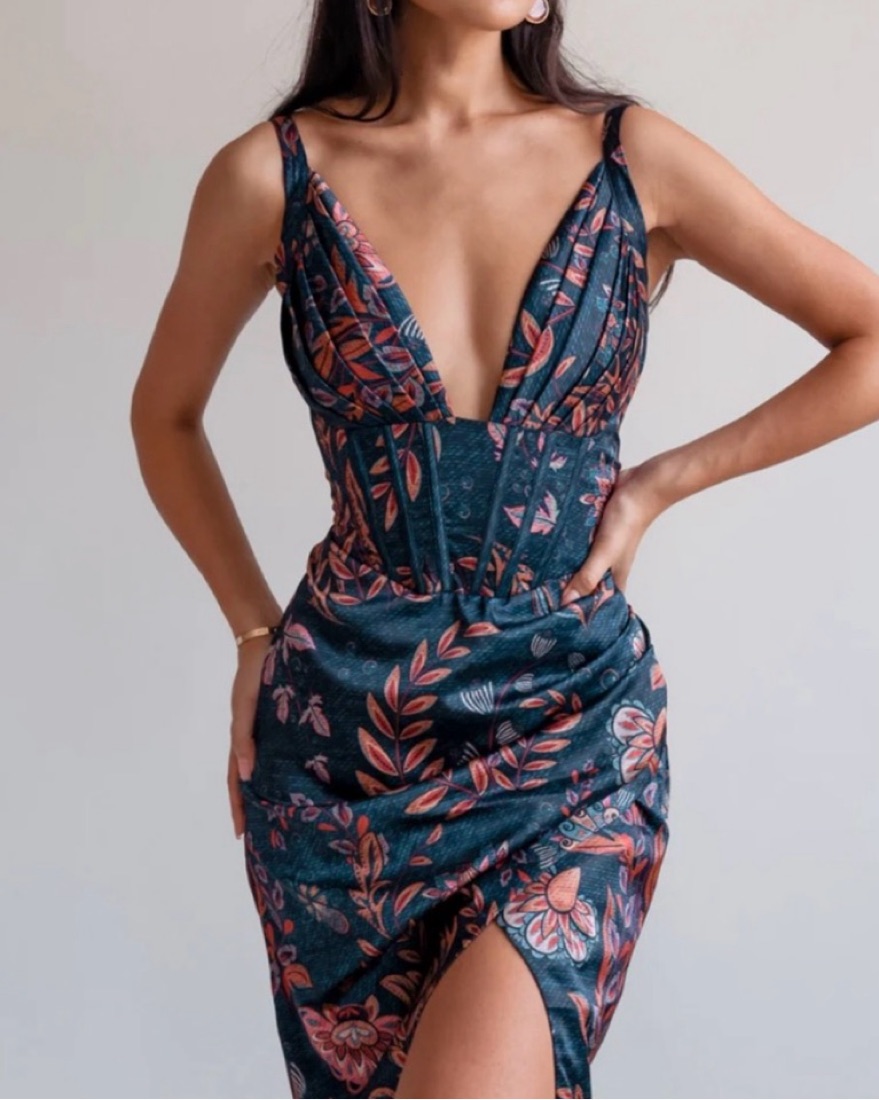 Corset top midi dress with beautiful floral pattern, ruched bottom and a slit. Worn knce for 2 hours. Accentuates your body beautifully. Soft fabric. Sustinably made. Small but a bit stretchy