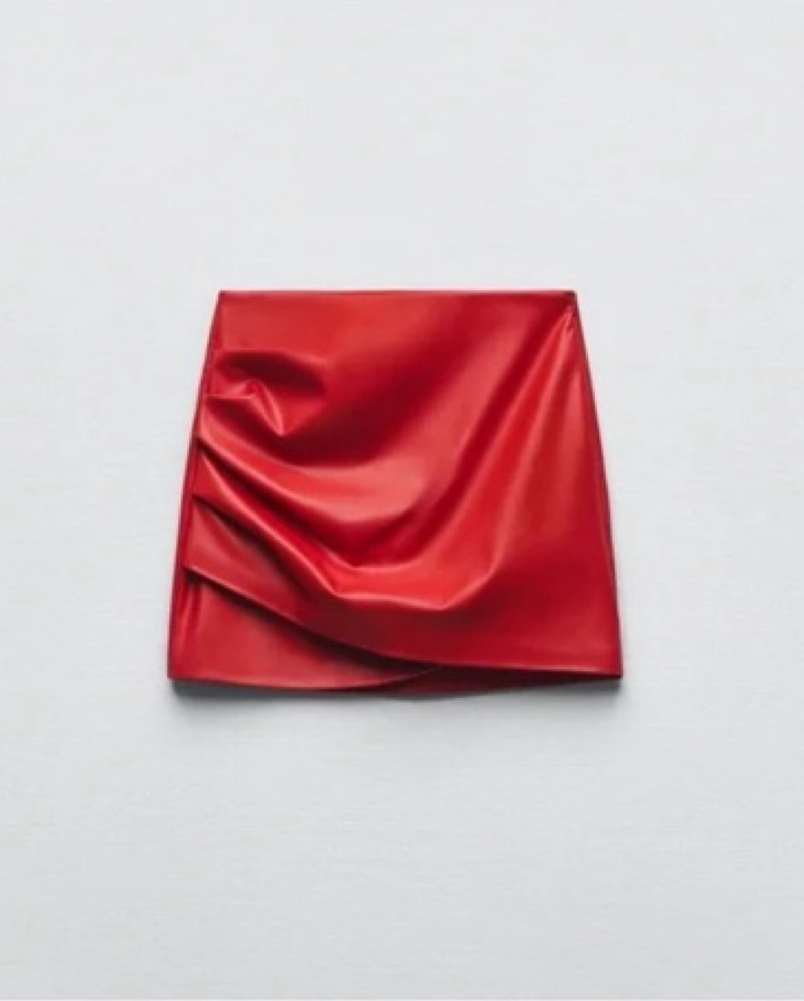 Zara red faux leather mini skirt, size small. Ruched fabric. Side hidden in-seam zip closure.