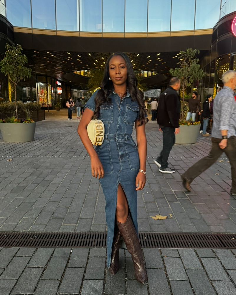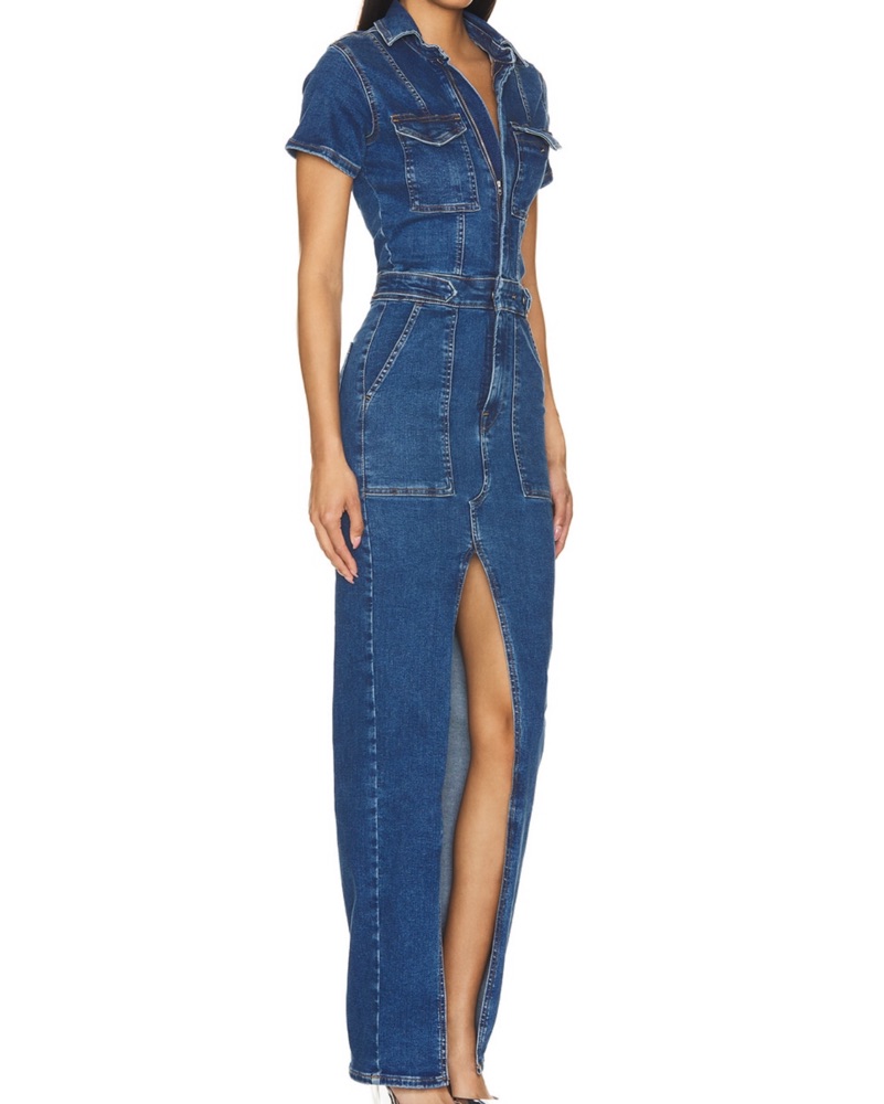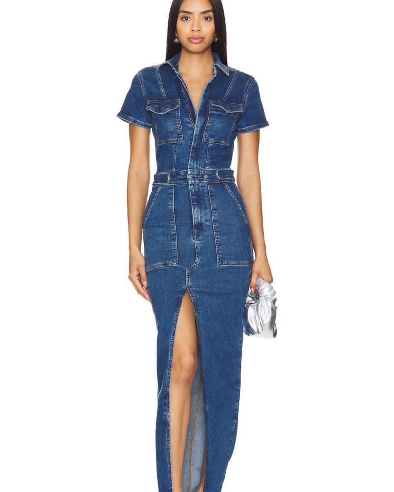 This chic denim maxi dress is perfect for a night out on the town. The thigh-high slit adds a sultry touch, while the fitted silhouette flatters the figure.