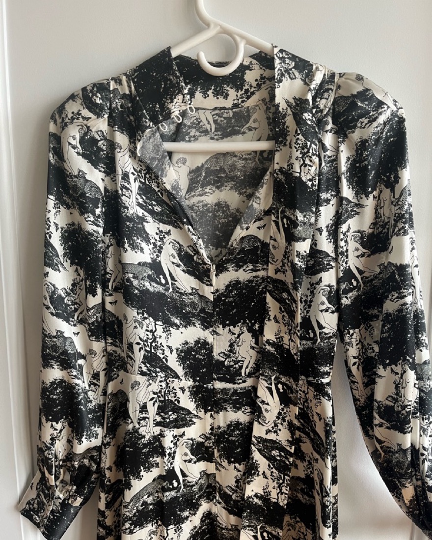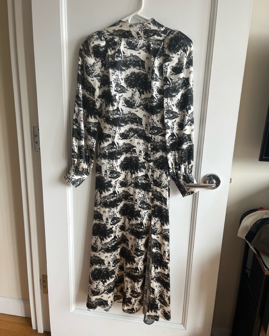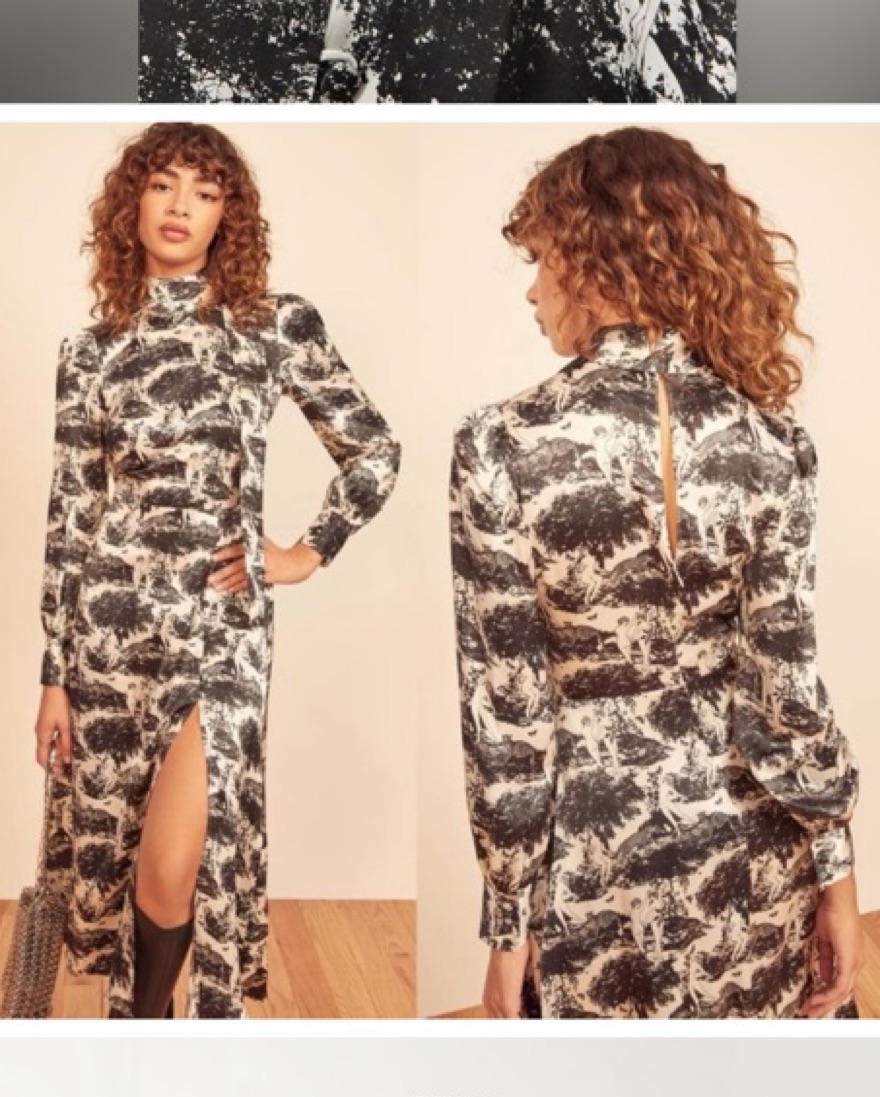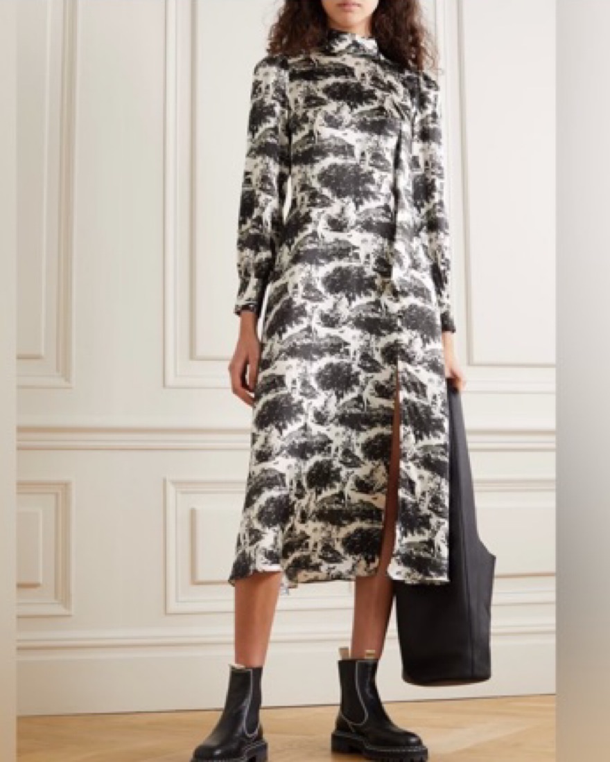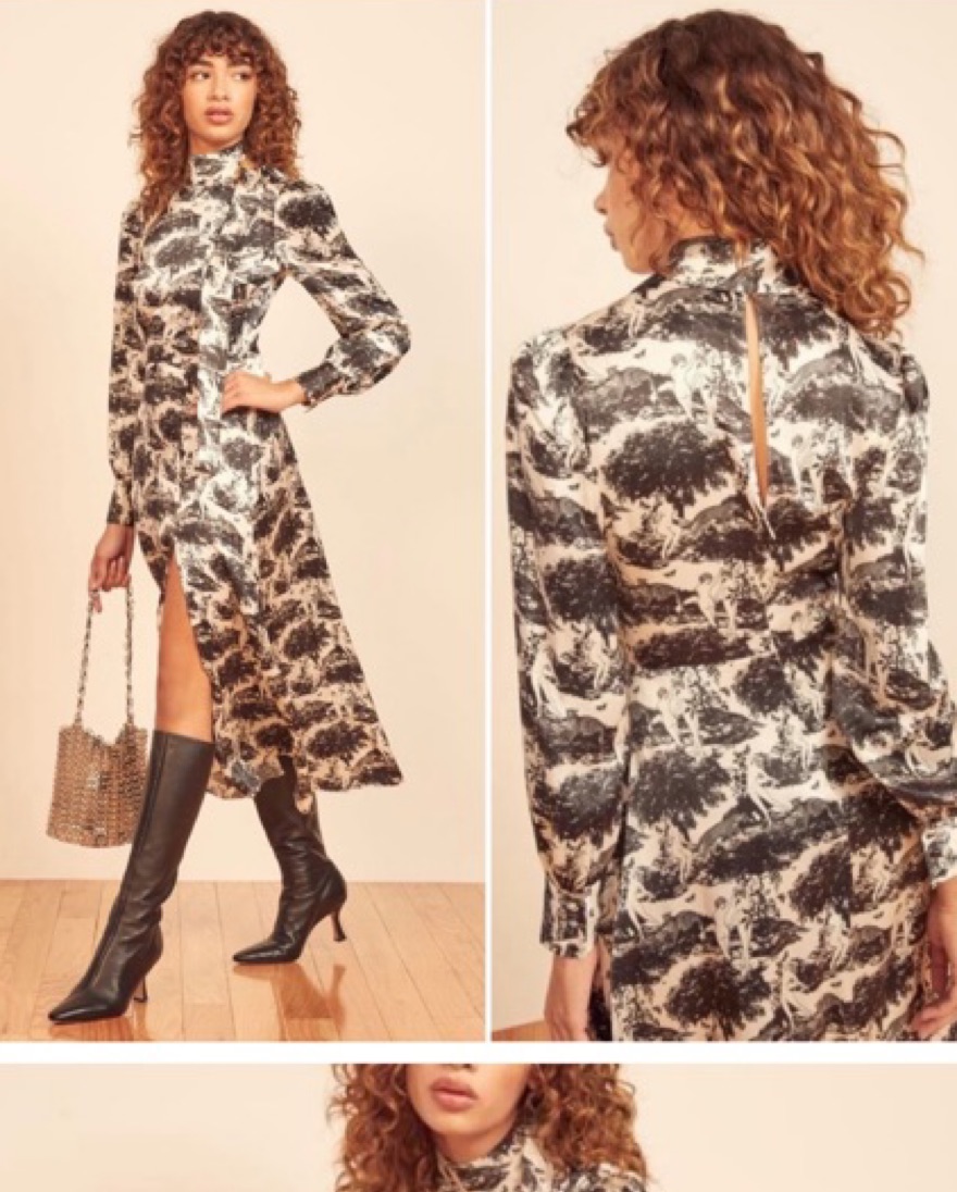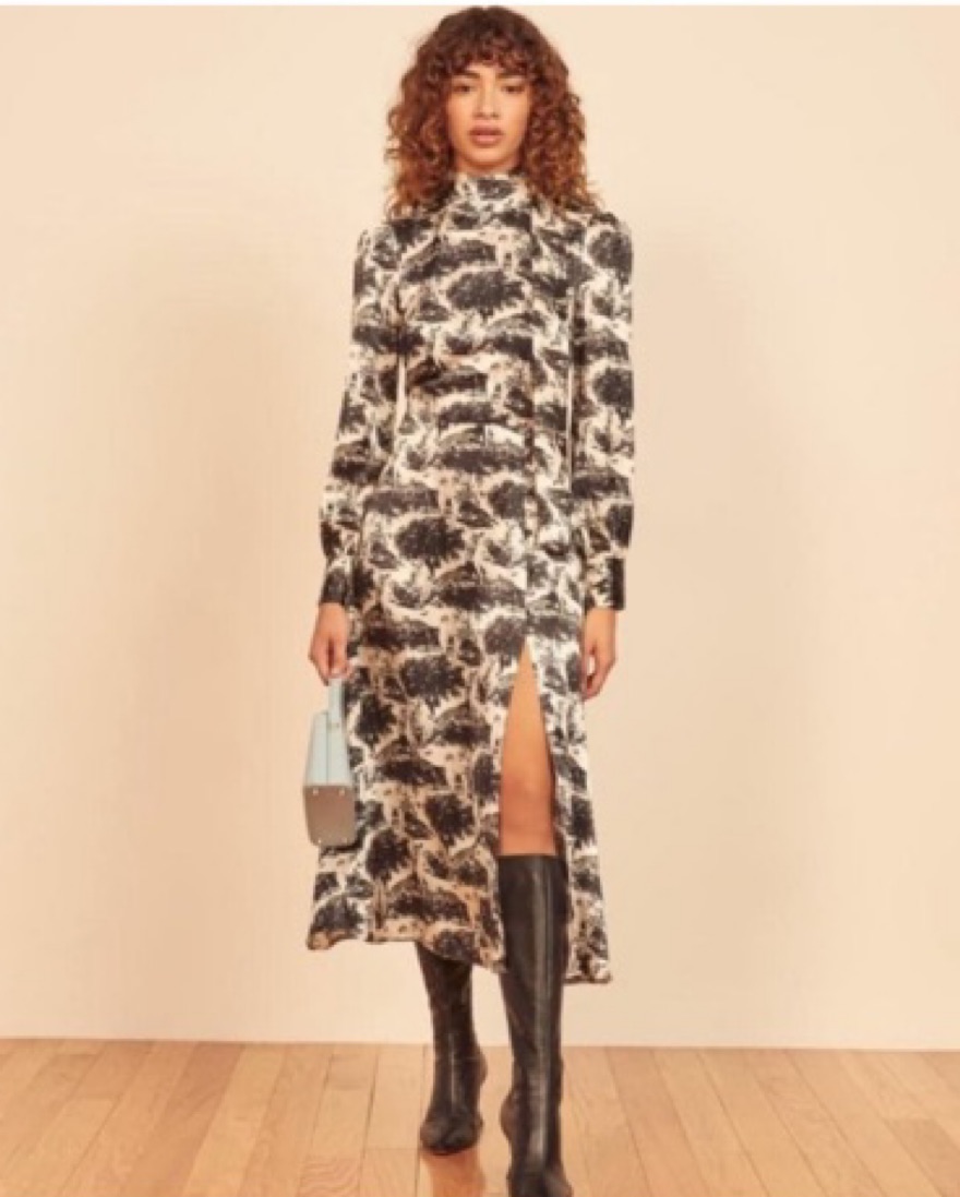 Reformation's 'Maple' dress is decorated with whimsical flora and fauna motifs evocative of traditional French toile de joie. It's made from silk-satin with subtle blouson sleeves and elegant neckties. The split skirt works well with knee or ankle boots.