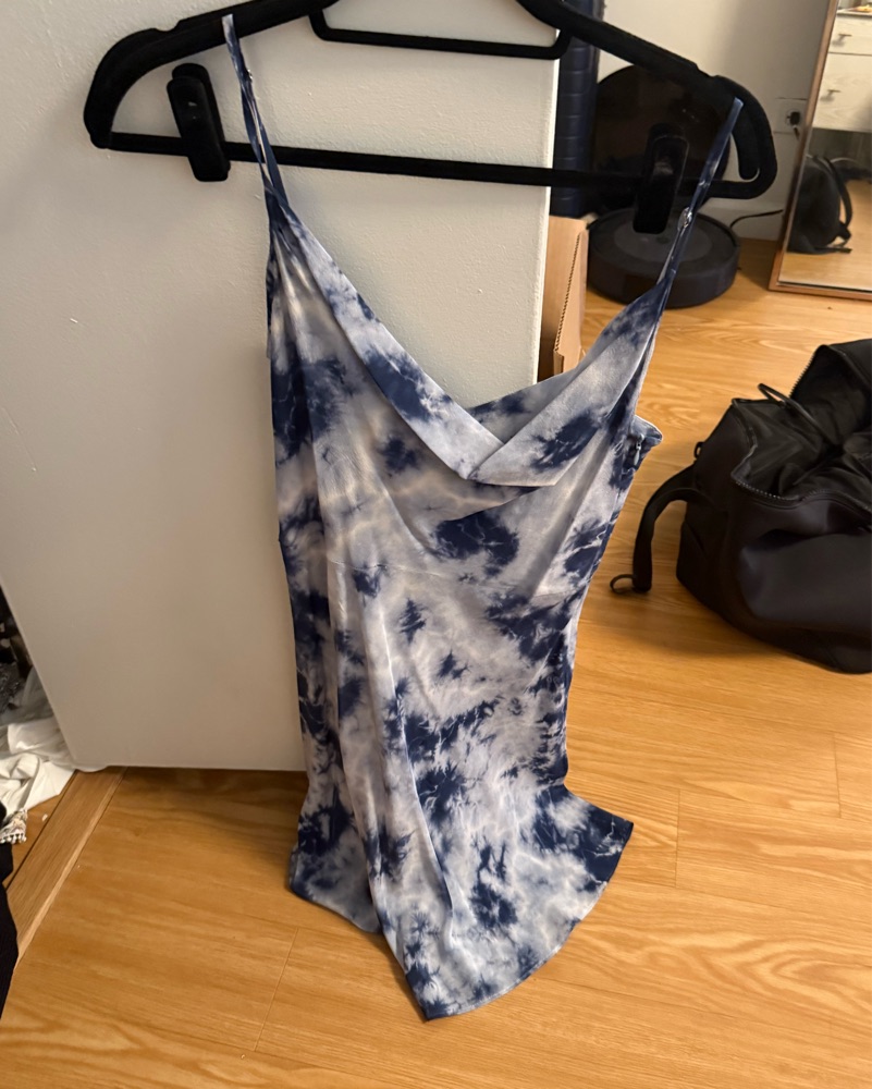 This eye-catching tie-dye slip dress is perfect for a chic, casual summer party or outing. The soft, fluid fabric and flattering silhouette make it a versatile wardrobe staple.