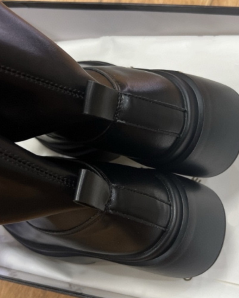 Sleek black knee-high boots with chunky platform sole and smooth stretch-fit shaft.