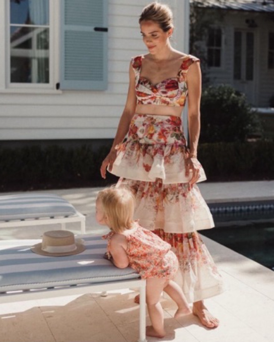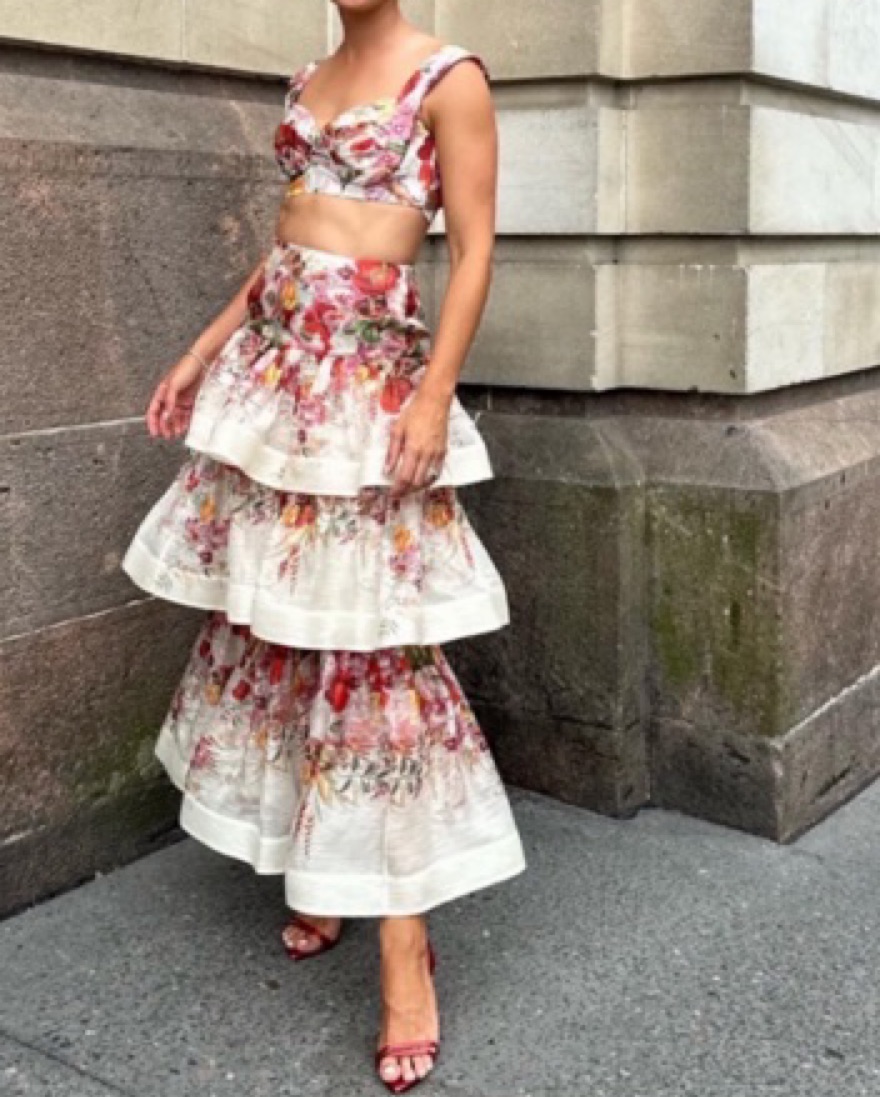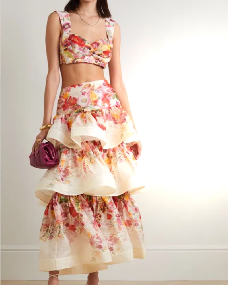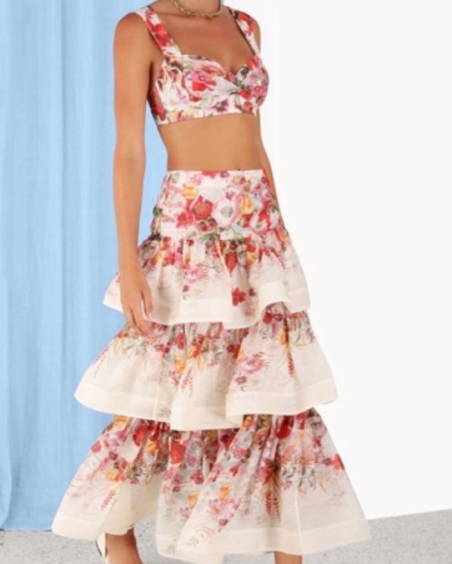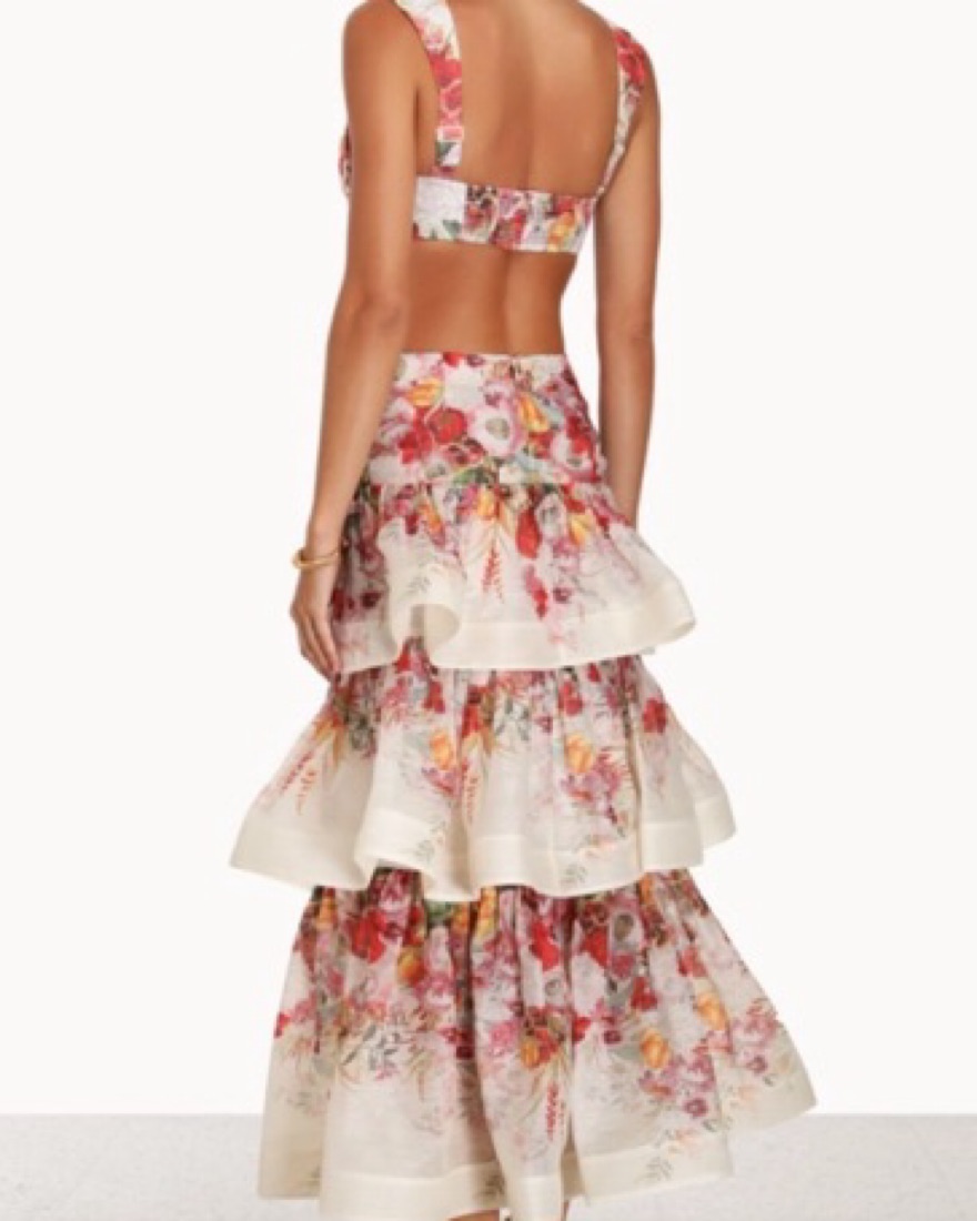 The Wonderland Bralette and Tiered Skirt in Elka Poppy Ivory Print from Zimmermann's Spring 2023 Collection. A silk linen bralette featuring placement print throughout paired with a silk linen organza skirt featuring a drop waist with frilled tiers.