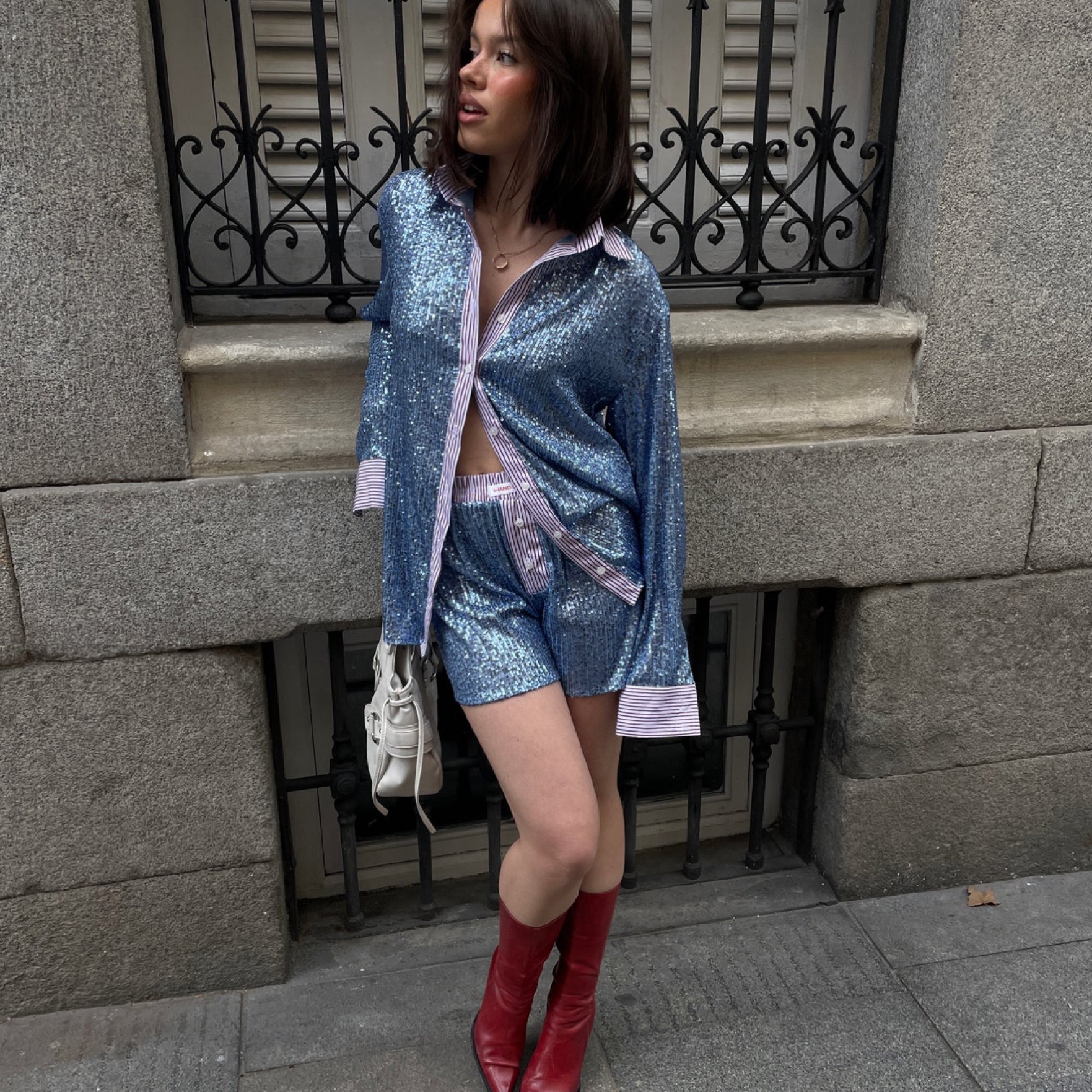 Short sequin boxer shorts, high-waisted, with an elastic waistband