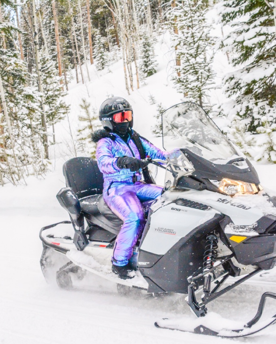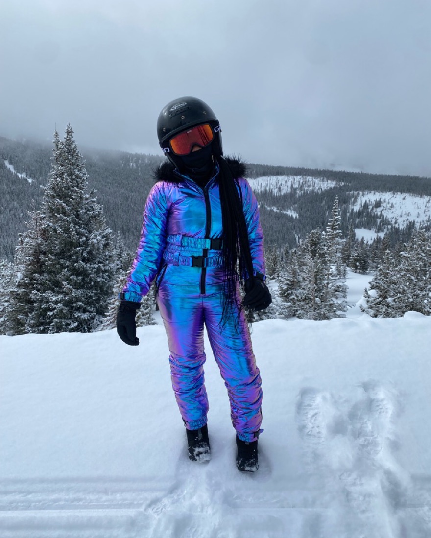 Small metallic one piece snow suit. I am 5’2. I weigh about 150 pounds. I wore 2 layers under it, and I was snug and warm!
