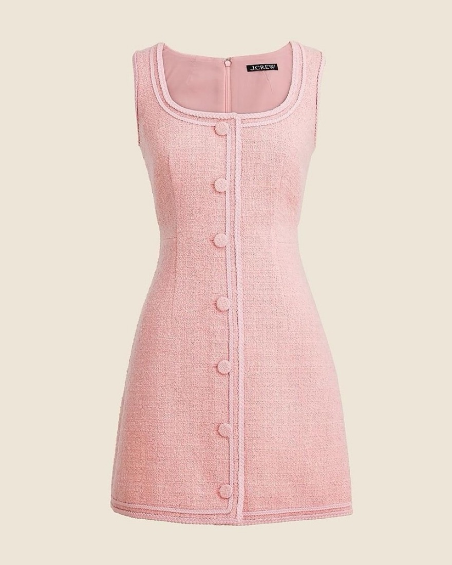 This timeless pink tweed dress is perfect for a variety of occasions, from a day at the office to a special event.