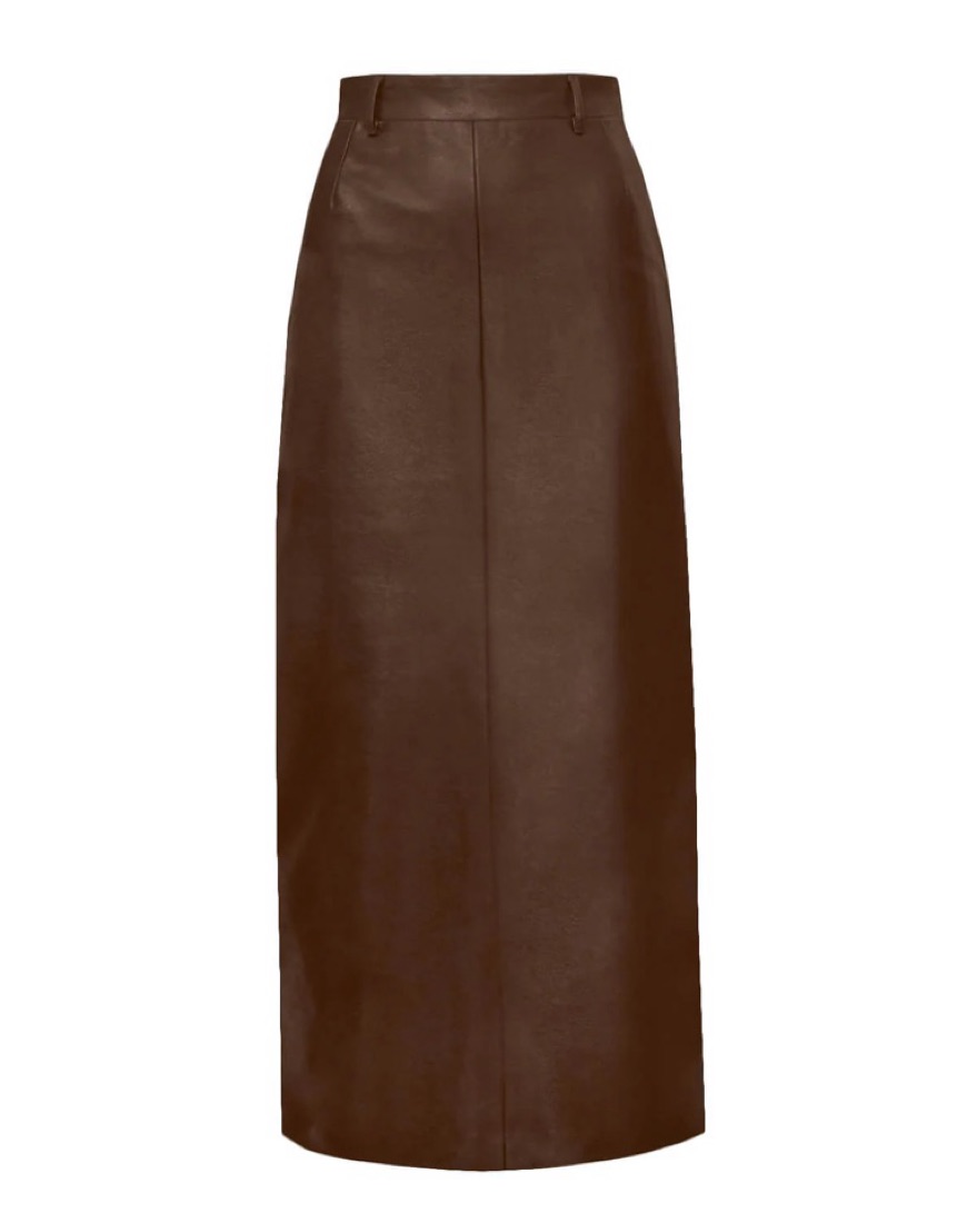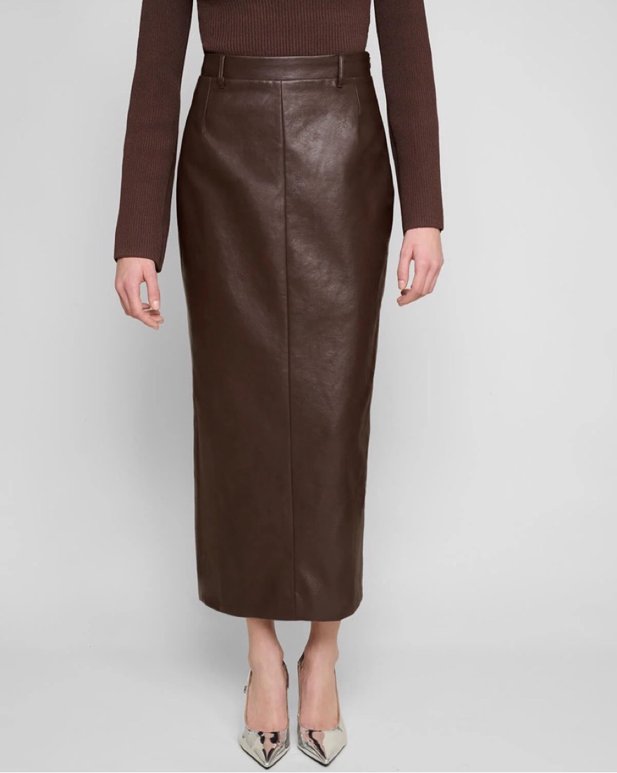 Chic dark brown thick matte leather skirt with belt loop waist and slit back hem. 100% faux leather Fully lined Size XS waist 24" hips 35.5"