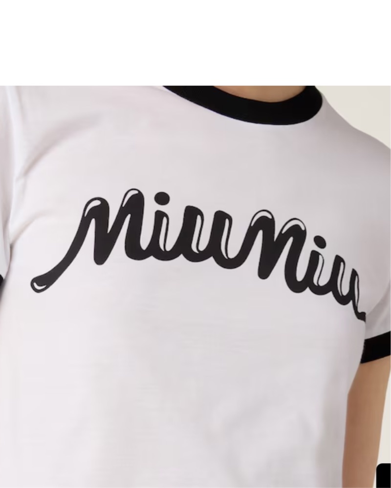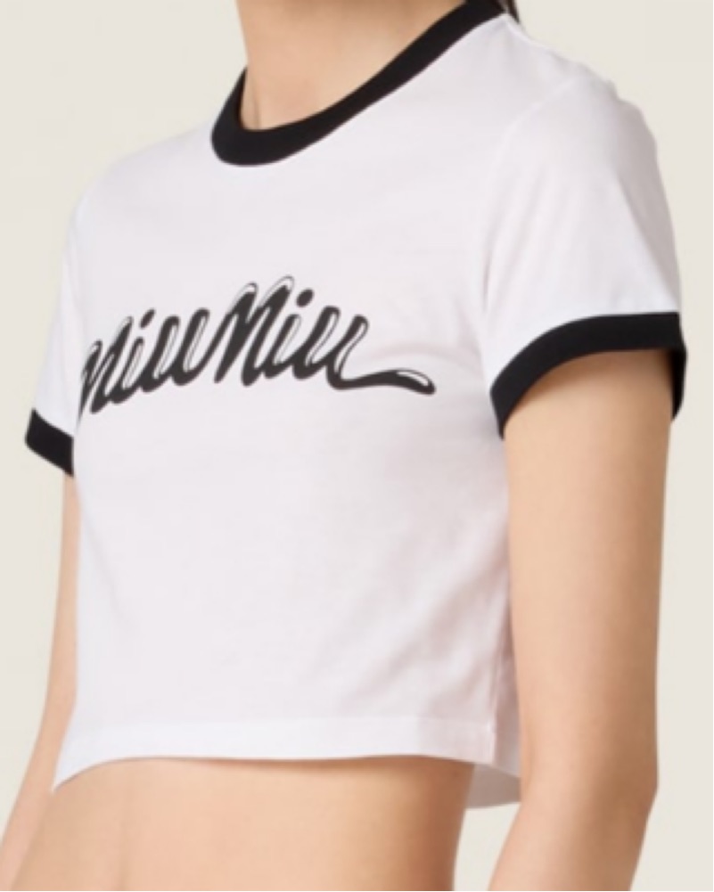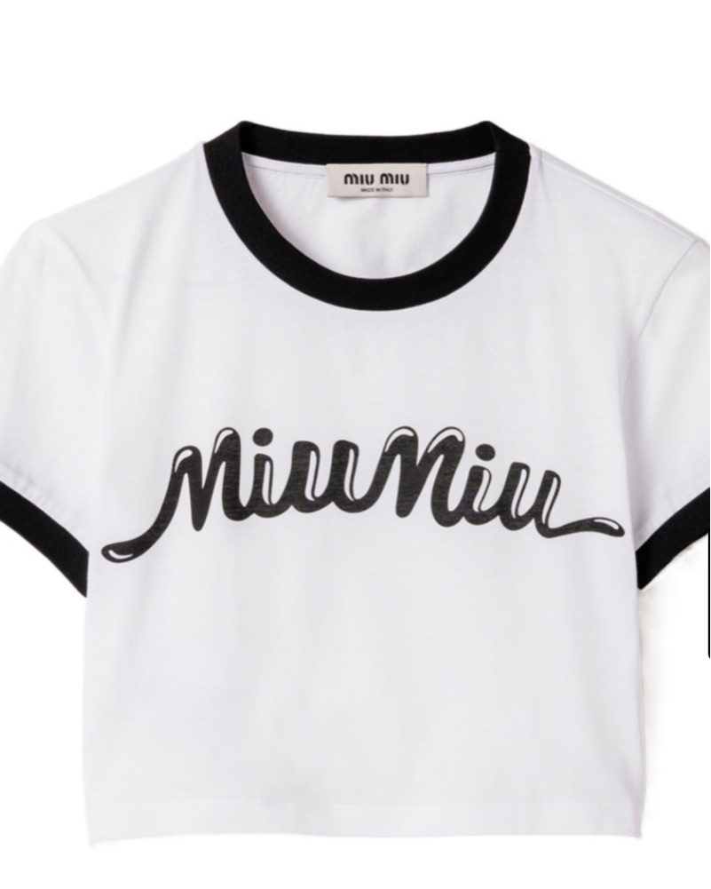 This Miu Miu cropped tee is the perfect piece to pair with your favorite jeans or joggers for a stylish yet casual look. The bold logo graphic adds a fashionable touch.